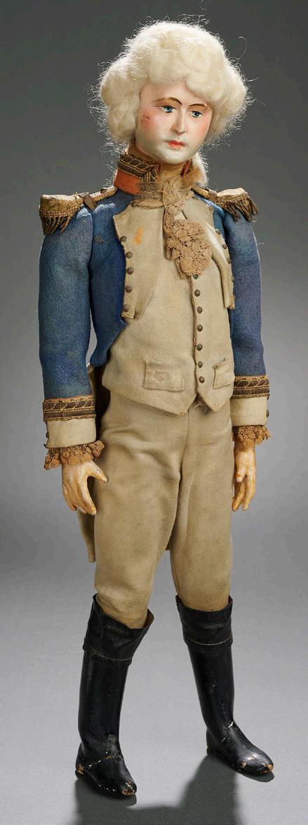 25” (64 cm.) Solid domed shoulderhead with painted complexion over gesso, small brown enamel inset eyes in well-detailed sockets, tinted brows and nostrils, closed mouth, blushed cheeks and well-defined chin tip, fleece blonde wig in elaborate coiled coiffure under gilt metallic crown, wooden body with metal pin in back torso allowing posing changes, jointing at shoulders, modeled bent arms, expressively posed fingers, crude pin jointing at hips and knees. Condition: generally excellent, some retouch to hands. Comments: European, the doll was used in ceremonial parades and as exhibition display, early 1800s. Value Points: rare to find, especially in this fine condition, the doll is wearing original (some frailty) dress of metallic woven fabric, coarsely-woven undergarments, padded leggings with gold braid wrap, and carries a garland of flowers and silk ribbon. $4500/6500 16.