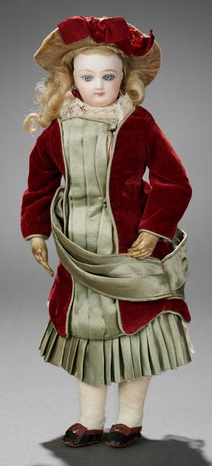 and wooden eightloose-ball-jointed body, nicely costumed. Condition: generally excellent, body repainted, eyes set. Marks: 17. Comments: Kestner, circa 1882. Value Points: very rare-tofind grand exhibition size of the early closed mouth child, original early body, fine quality of bisque. $1200/1400