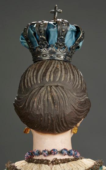 36” (91 cm.) including crown and base. 30” doll. All wooden carved doll with oval shaped face and elongated throat, brown sculpted hair with deeply-incised combmarks gathered in a chignon at the back of head, partly sculpted ears, heavily-modeled eyelids over brown enameled eyes, brushstroked brows, accented nostrils, closed mouth with defined philtrum; the head, torso and hands are carved as one unit, blue painted torso having tunic shape, carved definition of toes, jointing at elbows, expressive uniquelysculpted fingers. Condition: generally excellent. Comments: European, 1700s. Value Points: very fine sculpting of face, hair, fingers and feet, with original embroidered tapestry gown and (detachable) silver metallic crown, on gilt painted wooden base. $6000/8000