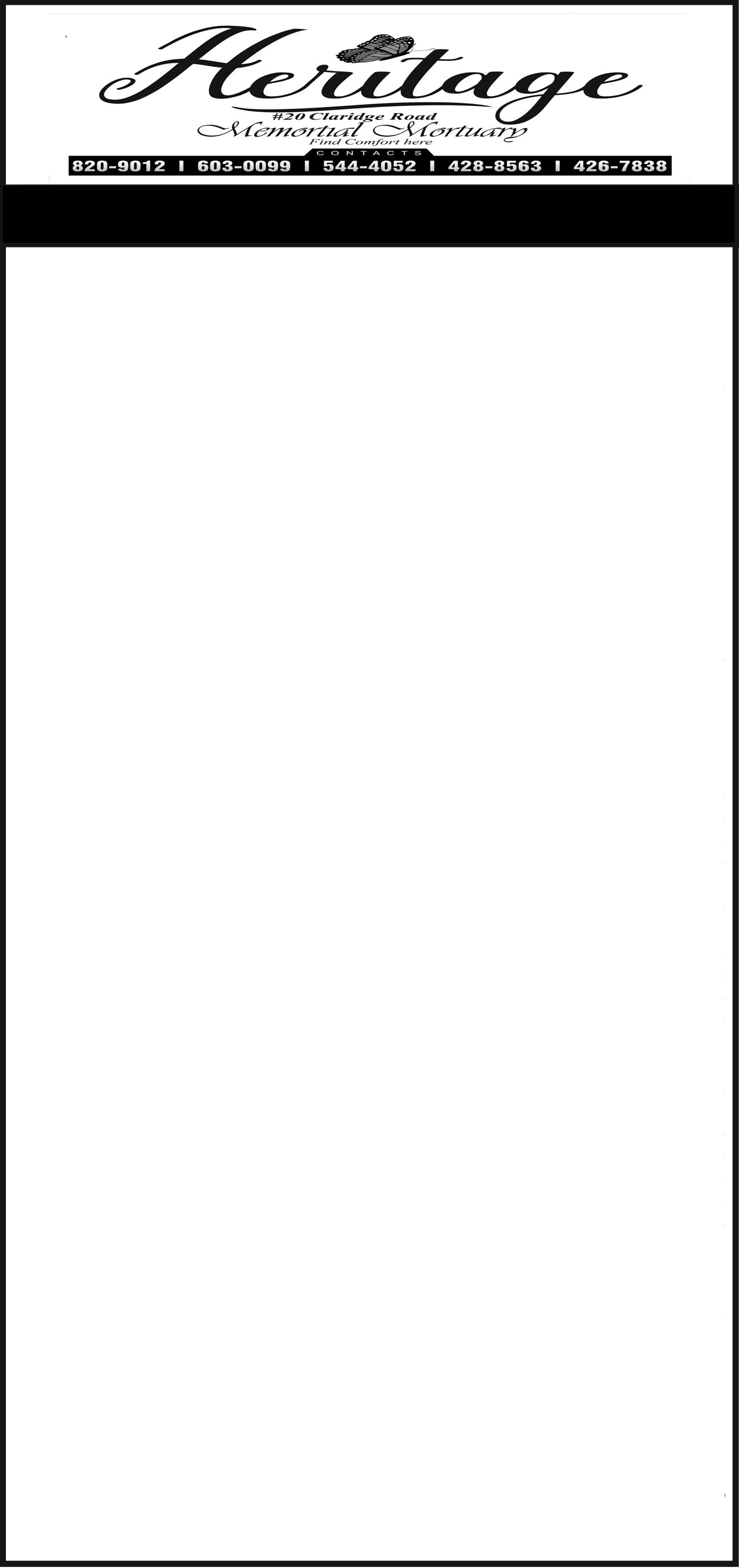 Relatives and friends may pay their last respects at Heritage Memorial Mortuary, #20 Claridge Road on Friday August 1st, 2025 from 11:00am until 3:00pm and on Saturday at the Church from 10:00am until service time.