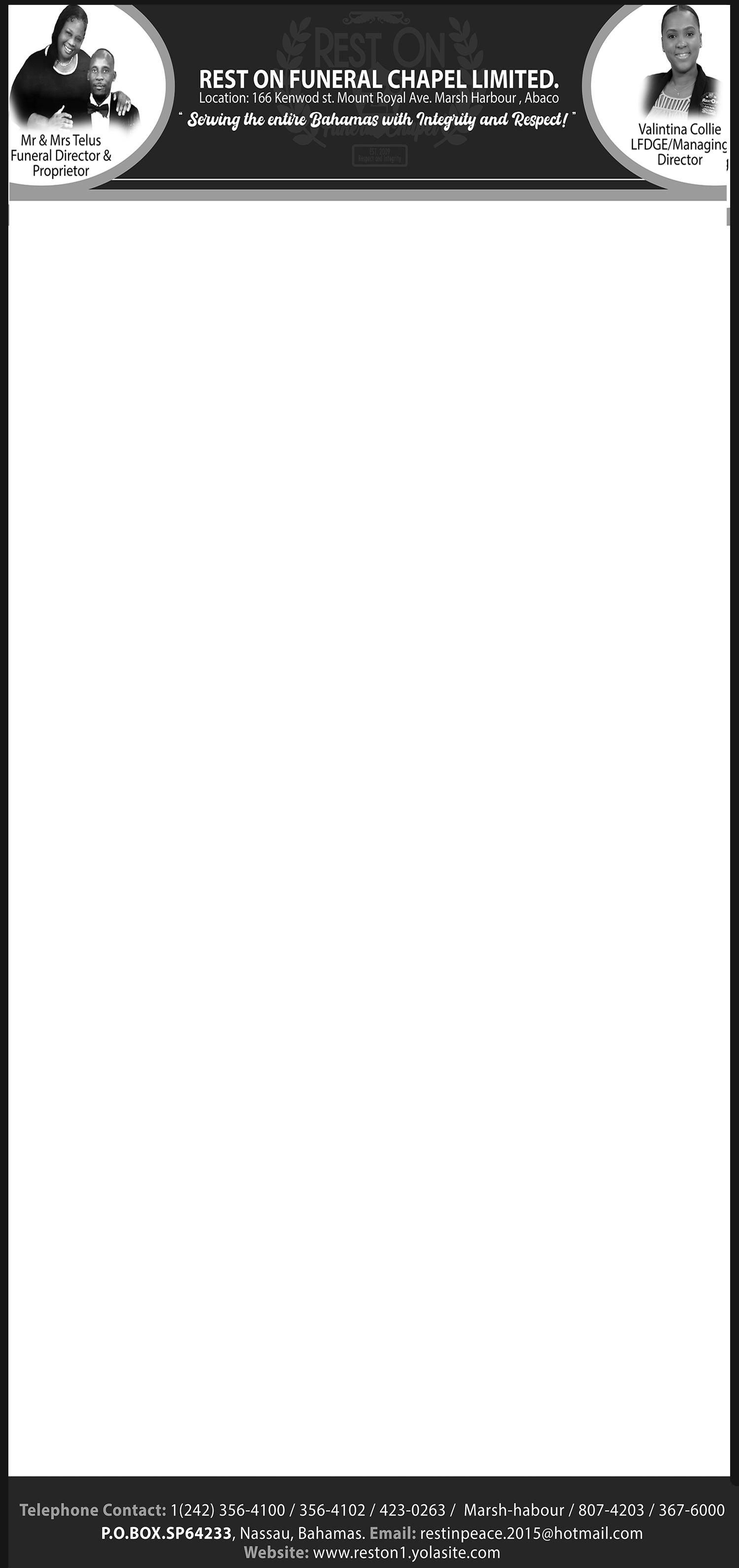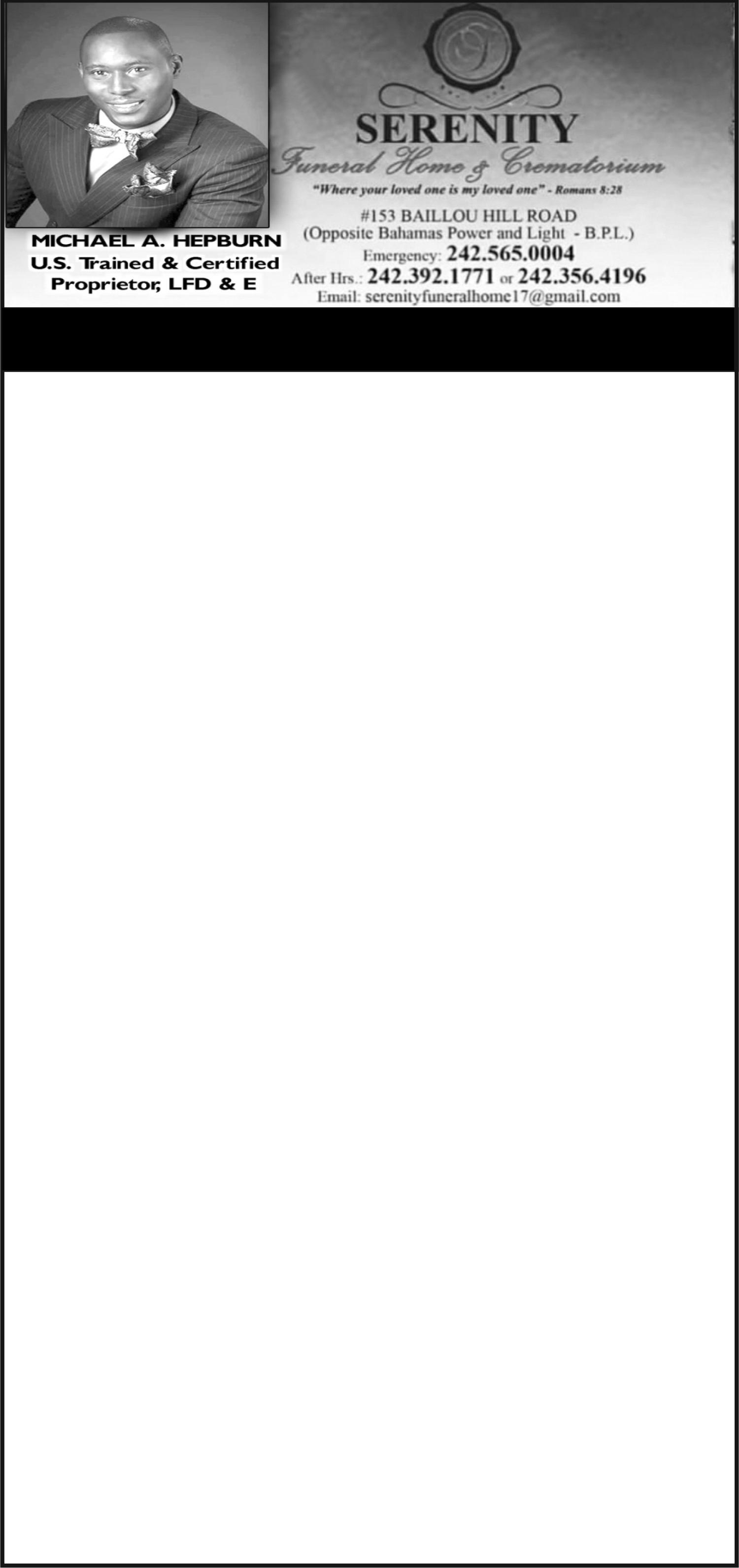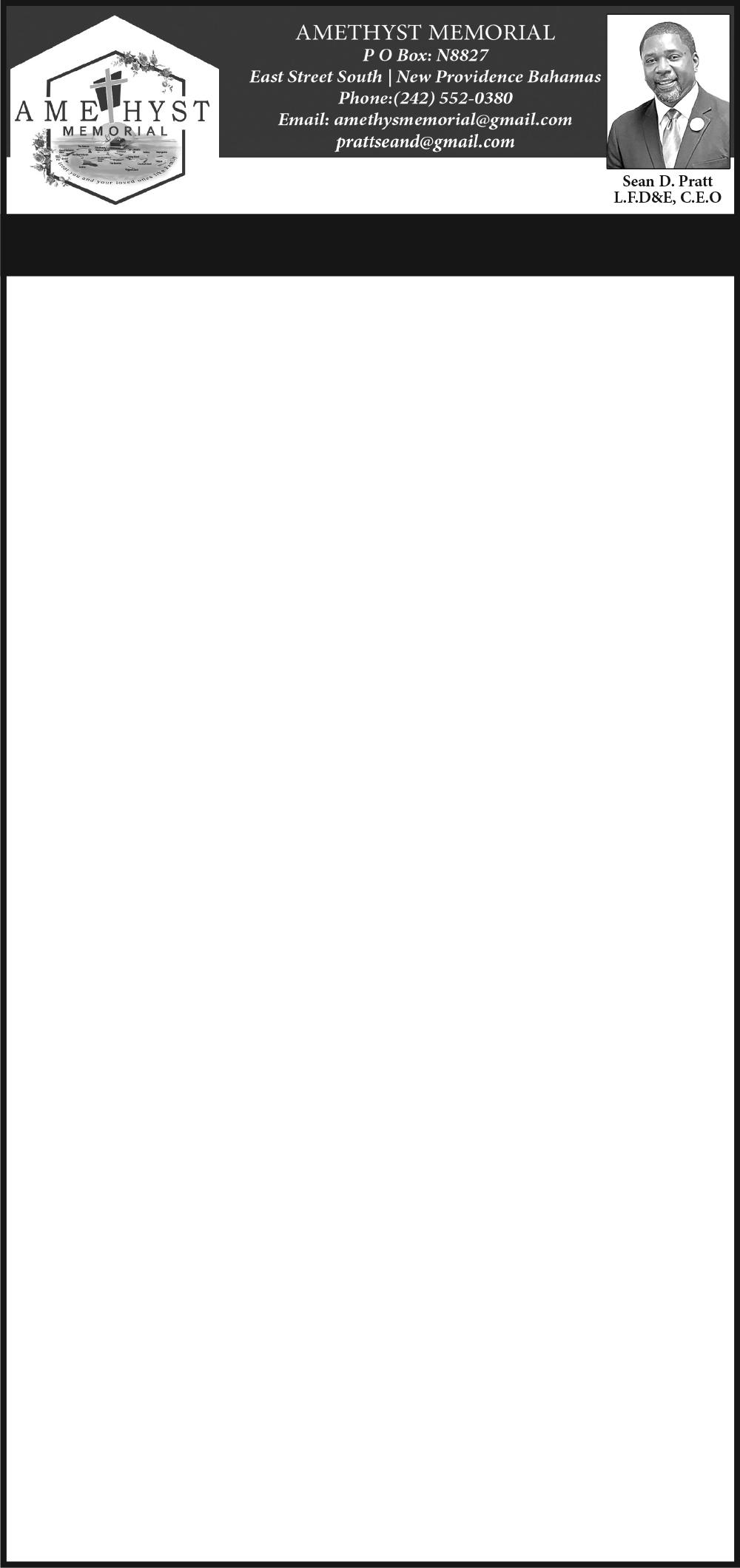 Viewing will be held at Eternal Rest Mortuary, #244 Market Street and Oxford Avenue, New Providence on (TODAY) Thursday, 31st July, 2025 from 10:00 a.m - 5:00 p.m. and again at the church on Friday, 1st August, 2025 from 9:00 a.m until service.