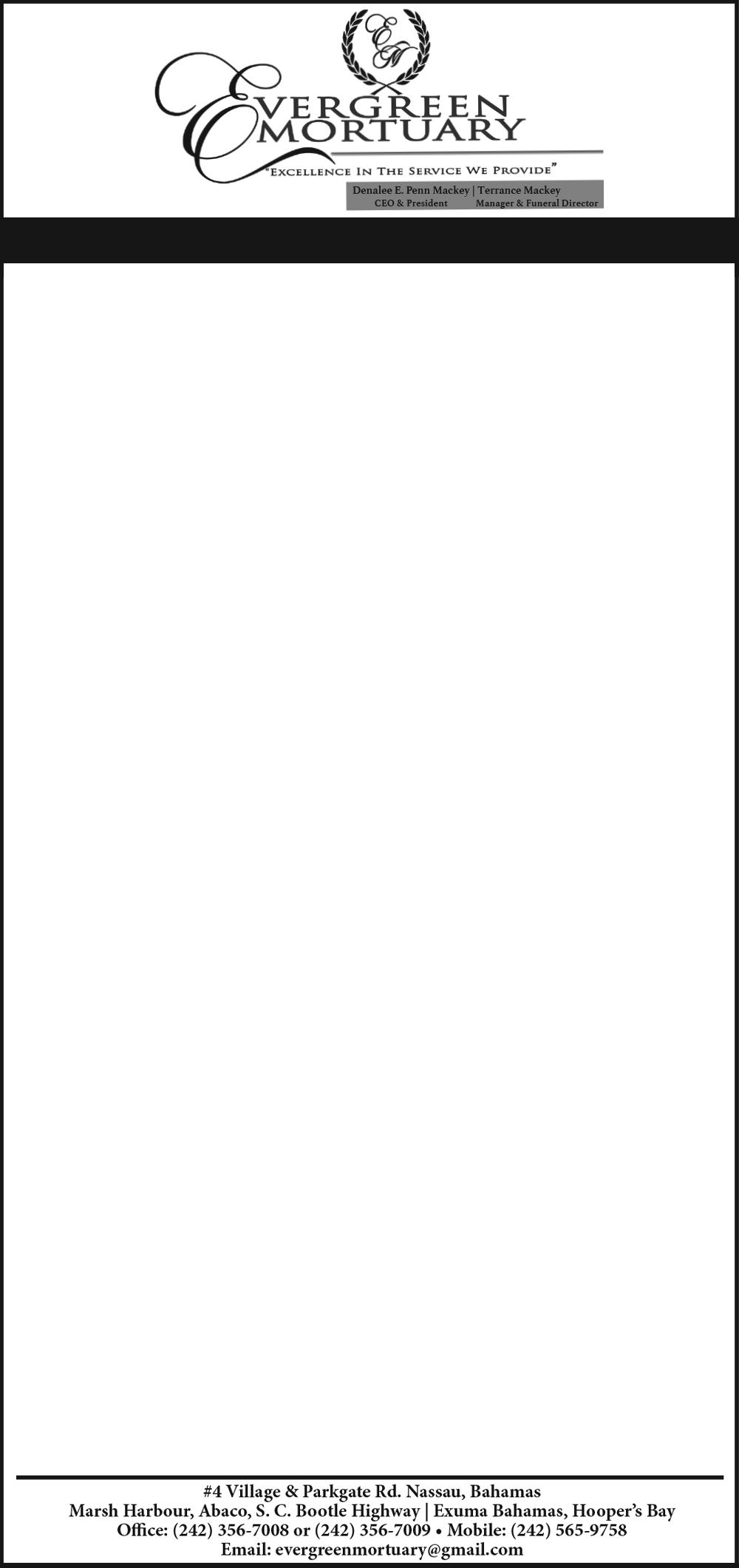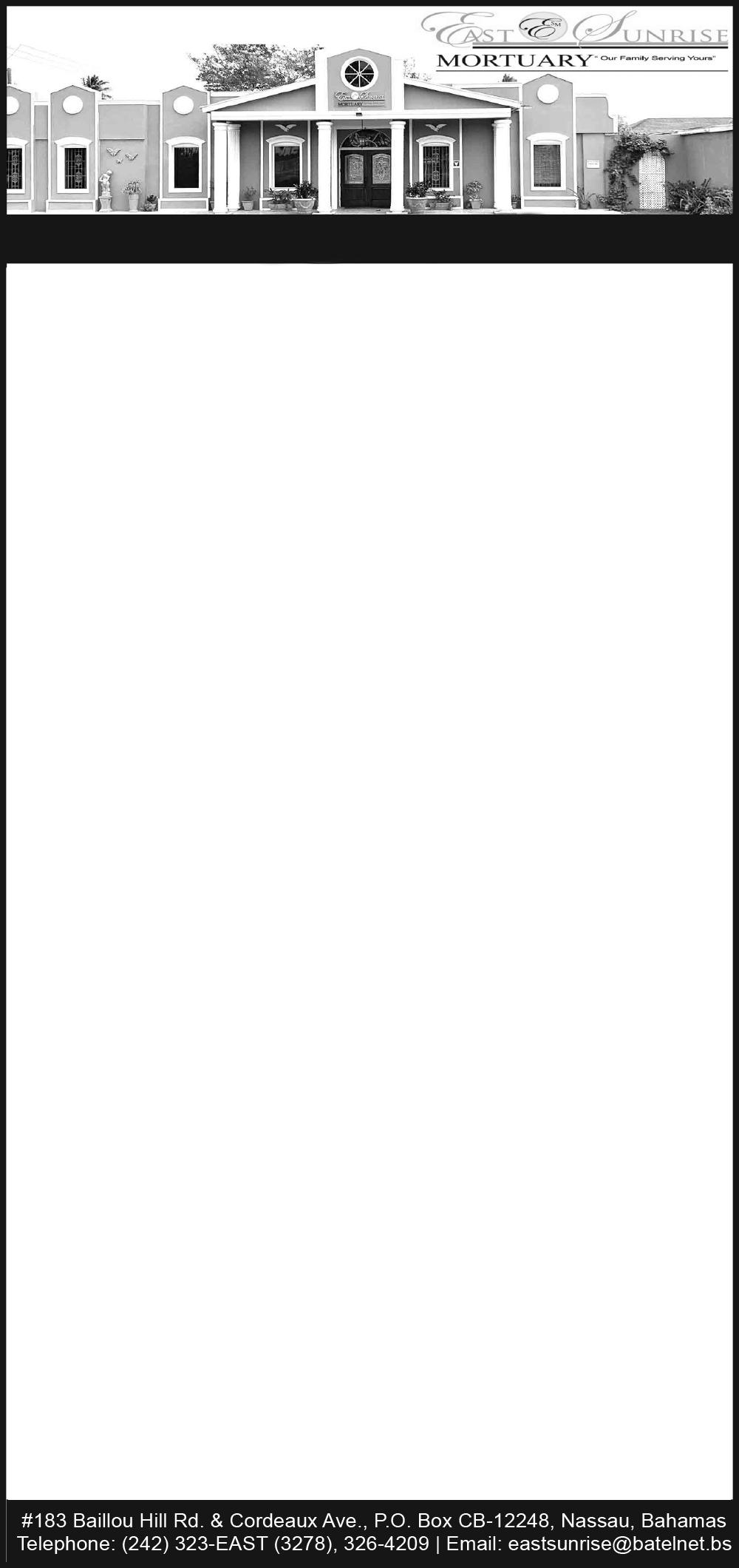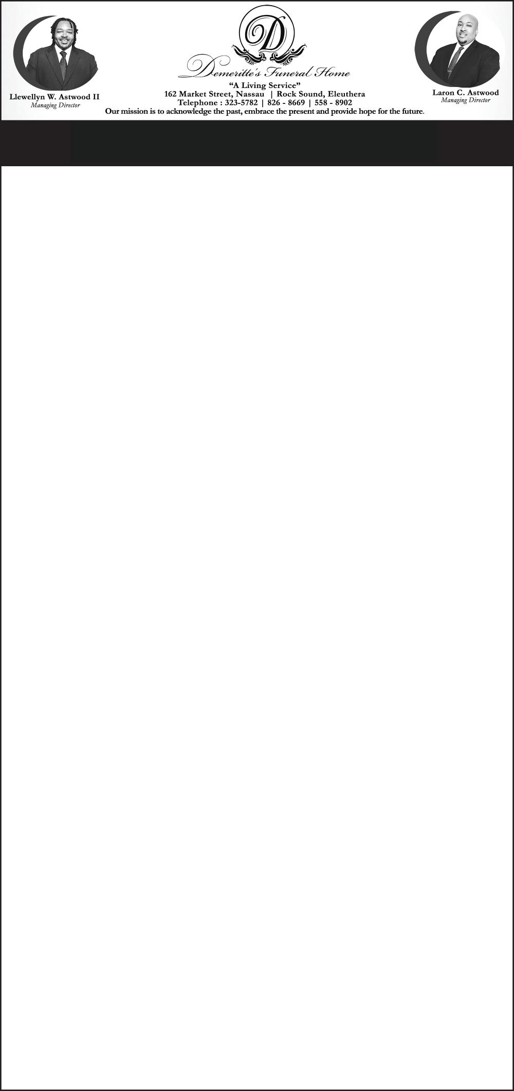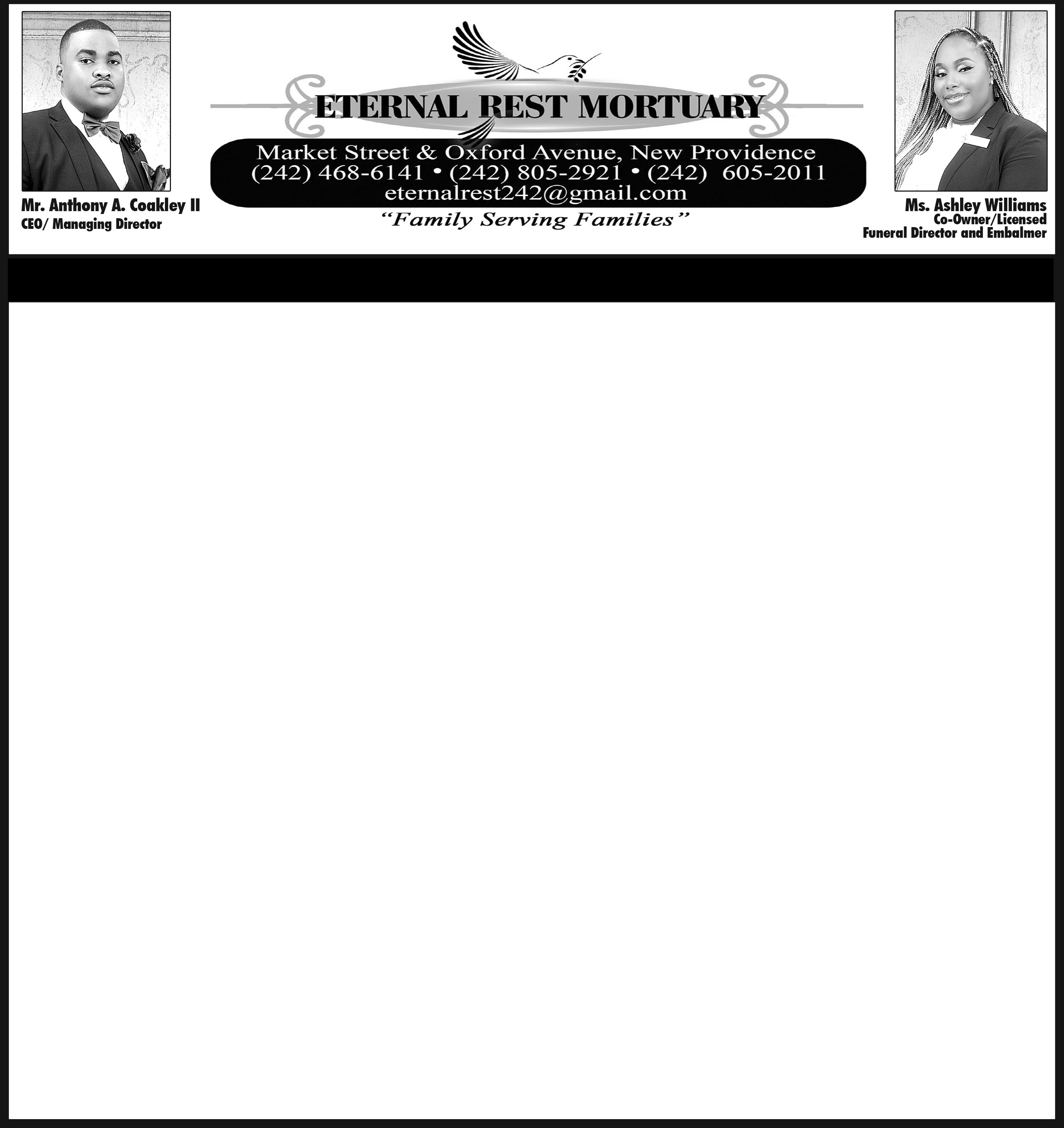 Viewing will be held at Eternal Rest Mortuary, #244 Market Street and Oxford Avenue, New Providence on (TODAY) Thursday, 31st July, 2025 from 10:00 a.m - 5:00 p.m. and again at the church on Friday, 1st August, 2025 from 9:00 a.m until service.