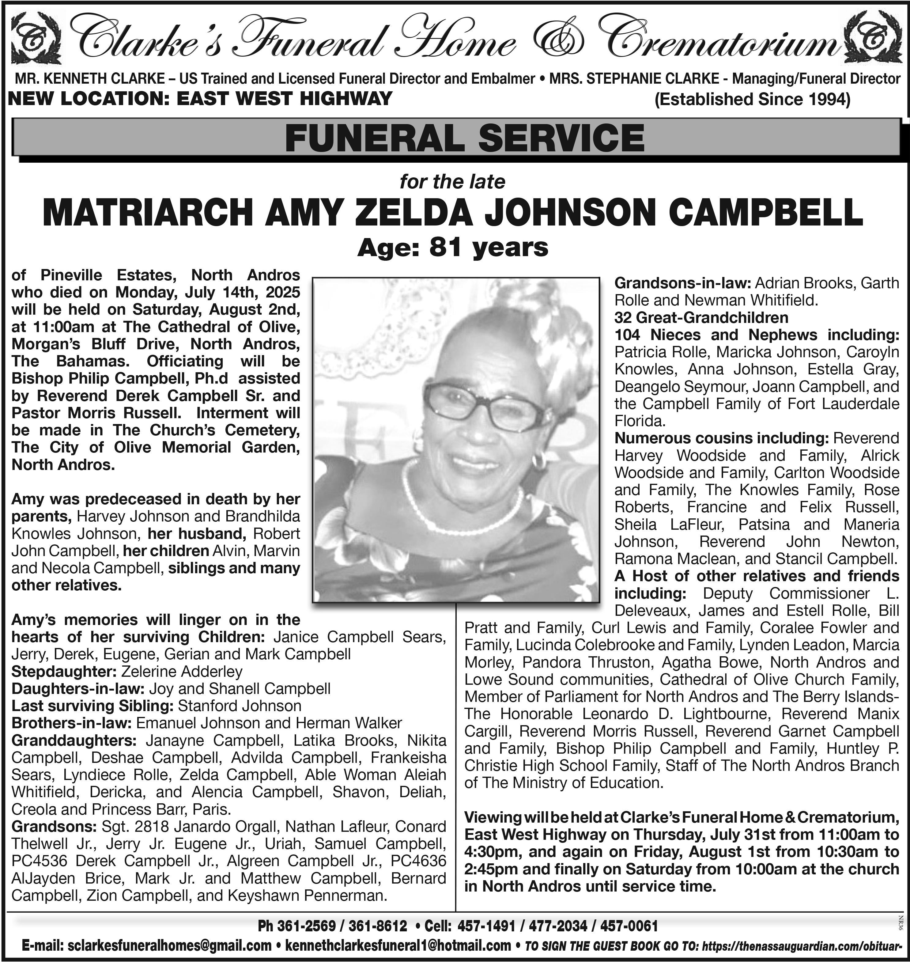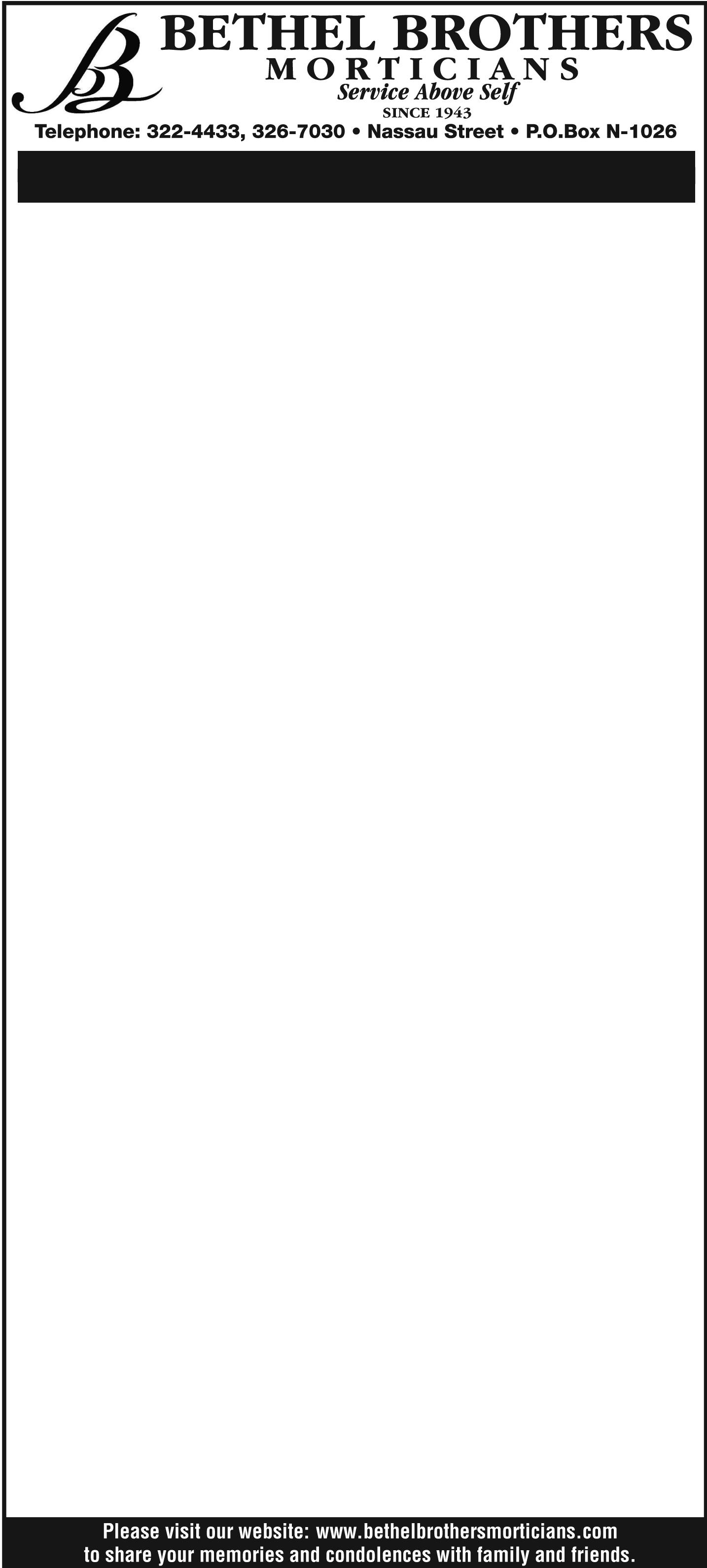 Friends may pay their last respects at Bethel Brothers Morticians and Crematorium, #44a Nassau Street on Friday 1st August 2025 from 9:30 a.m. to 5:30 p.m.