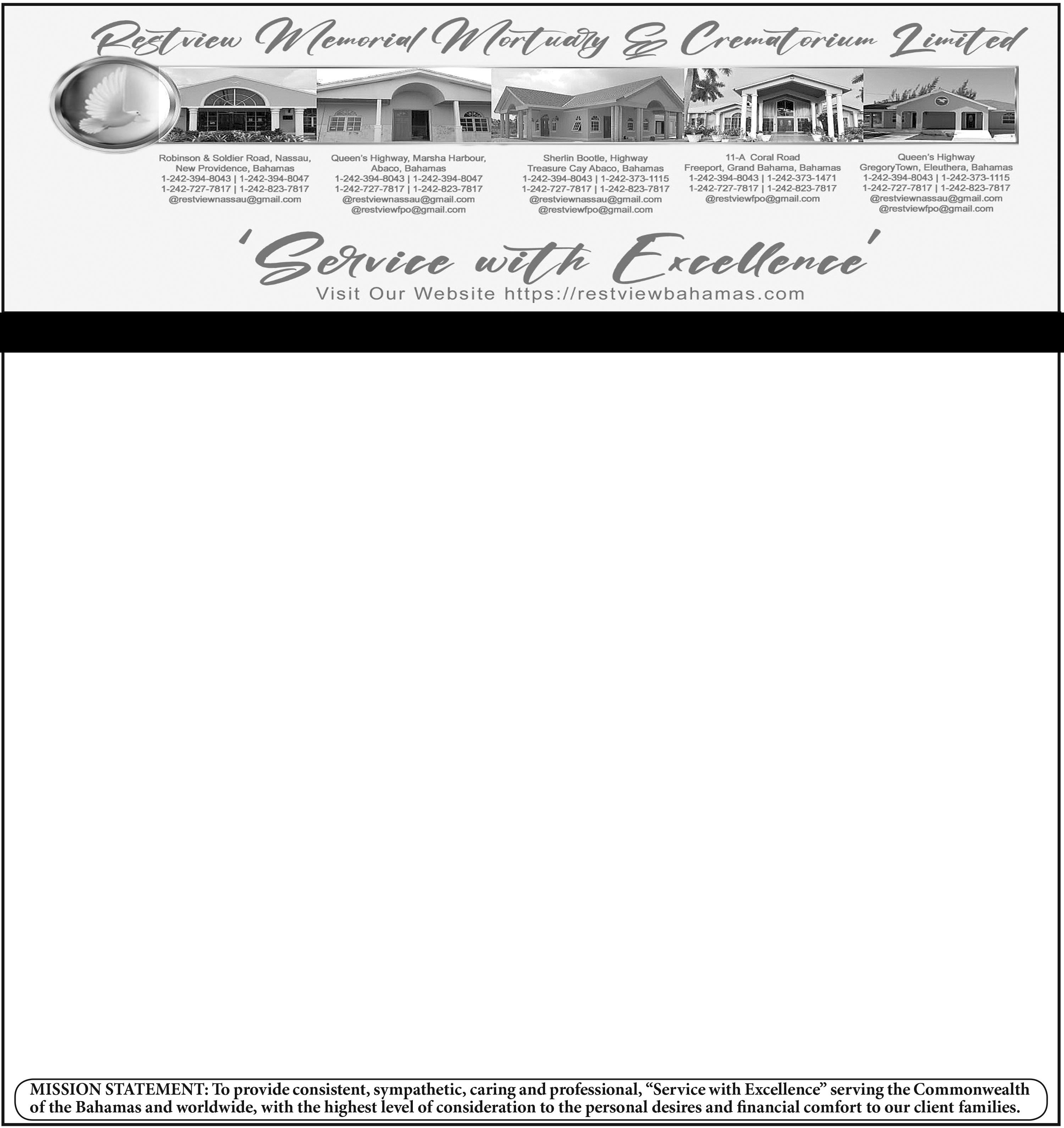 Viewing will be held in the “Celestial Suite” at Restview Memorial Mortuary and Crematorium Limited, #11-A Coral Road, Freeport, Grand Bahama on Friday from 10:00 a.m. to 5:00 p.m. and at the Church on Saturday from 8:30 a.m. until service time.