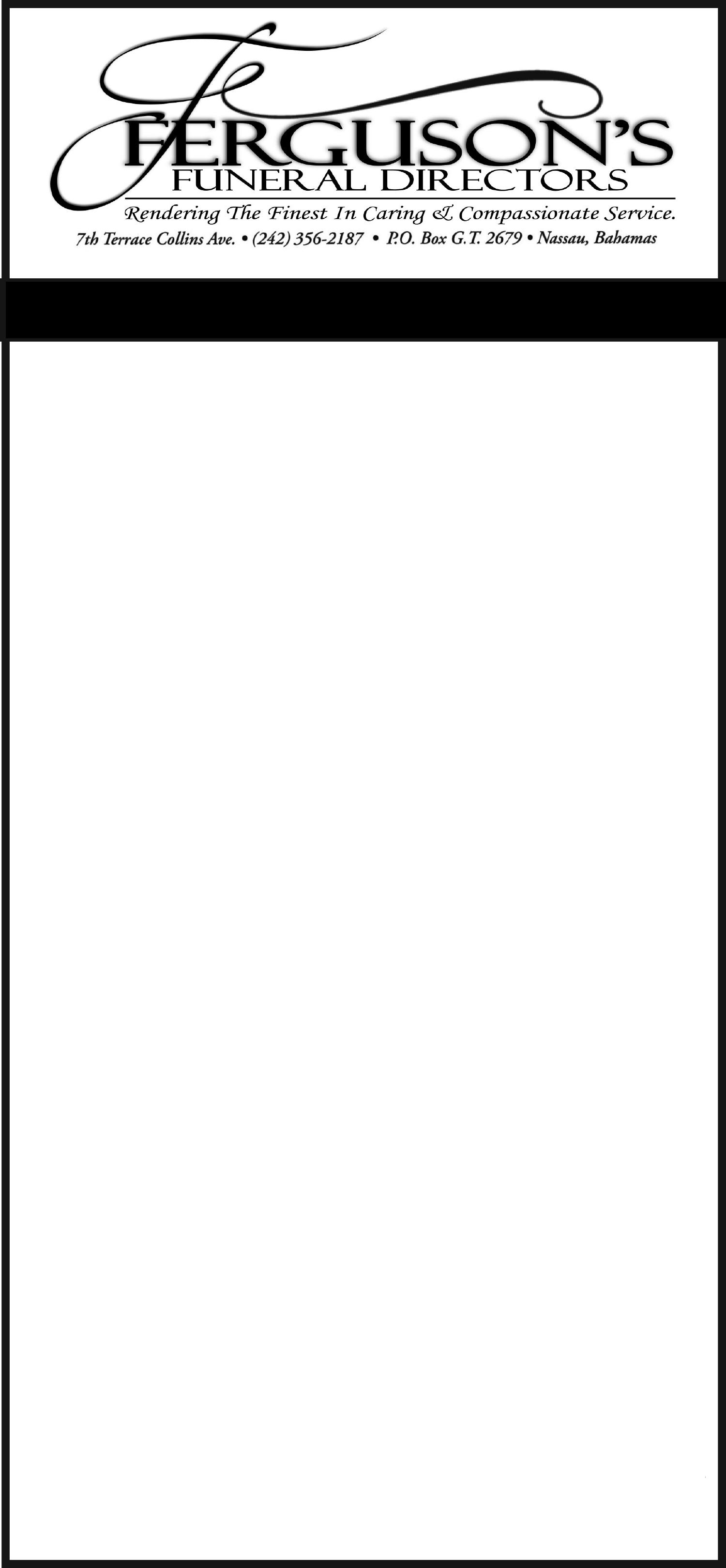The body will repose in the Blessed Redeemer Chapel at Ferguson’s Funeral Directors, 7th Terrace Collins Avenue on (TODAY) Thursday from 12:00 noon to 5:00pm and at the Church on Friday from 10:00am until service time.