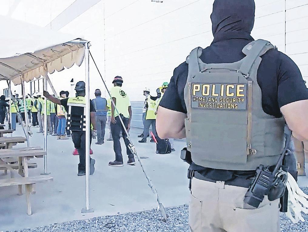 This image from video provided by U.S. Immigration and Customs Enforcement via DVIDS shows manufacturing plant employees being escorted outside the Hyundai Motor Group’s electric vehicle plant, Thursday, Sept. 4, 2025, in Ellabell, Ga.