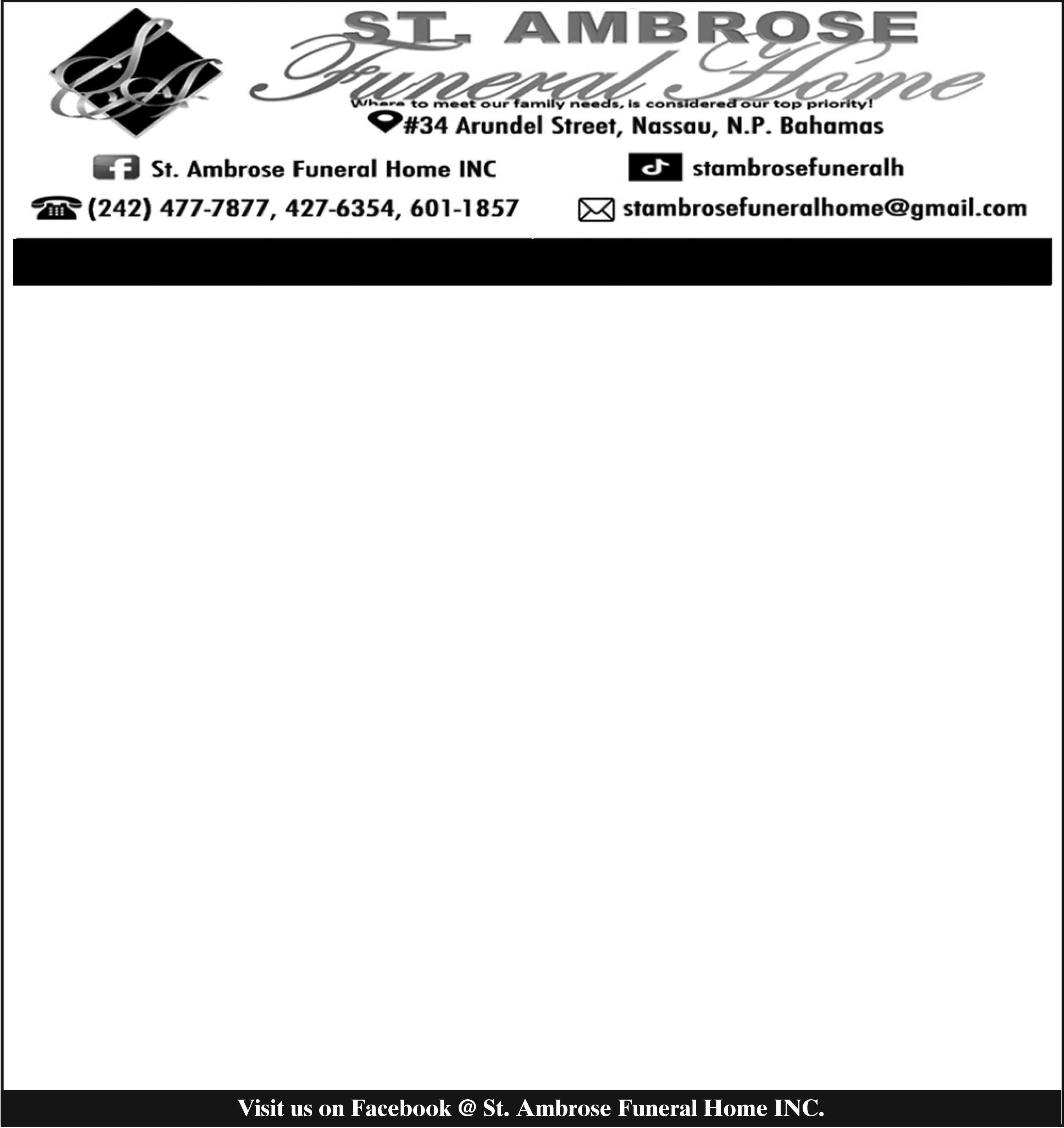 a resident of# 72 Whymper Lane, Freeport, Grand Bahama, Bahamas will be held at 11:00 a.m. on Saturday, 20th September, 2025 at The Chapel of Yager Funeral Home Freeport, Grand Bahama. Offciating will be Bishop Ghaly Swann. Cremation was held.