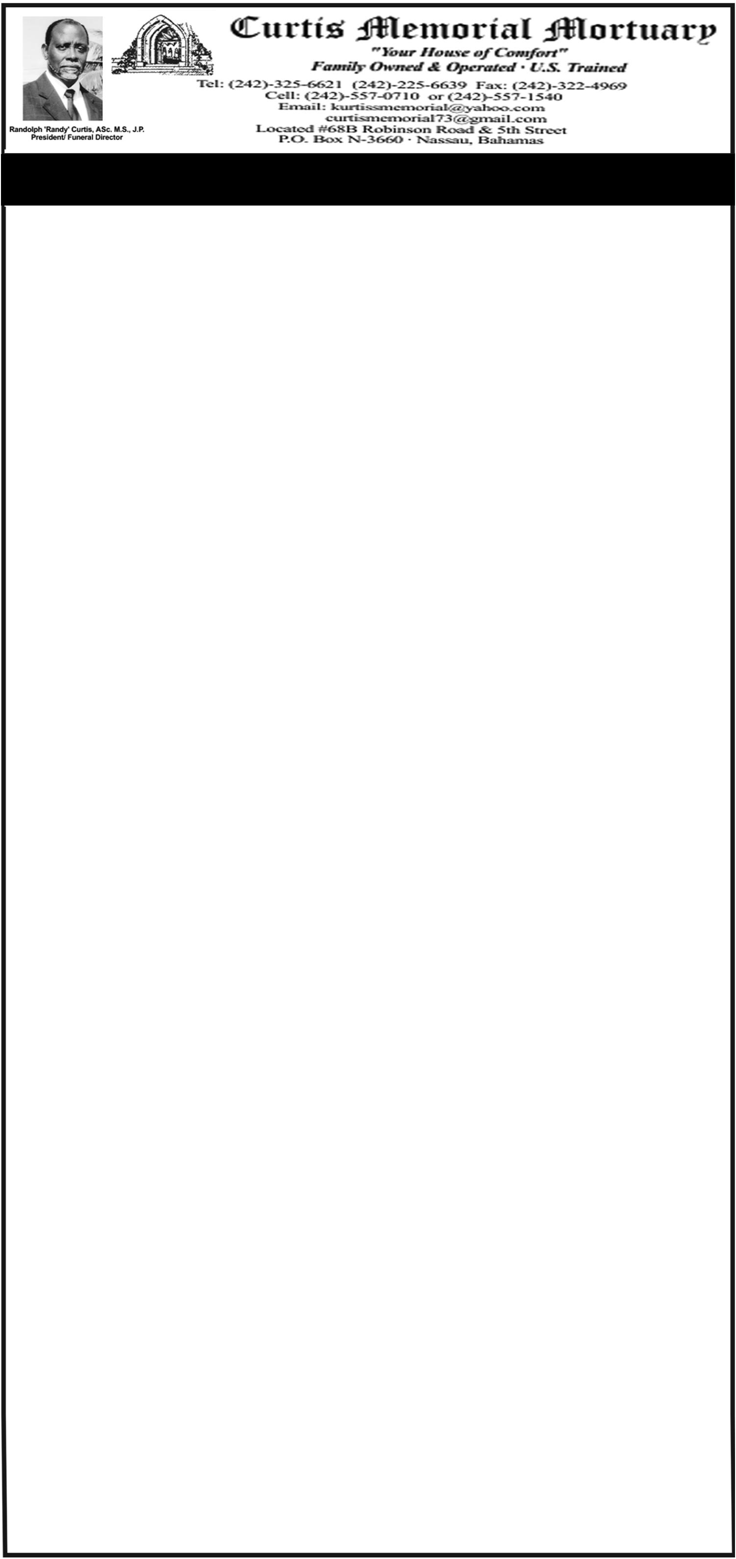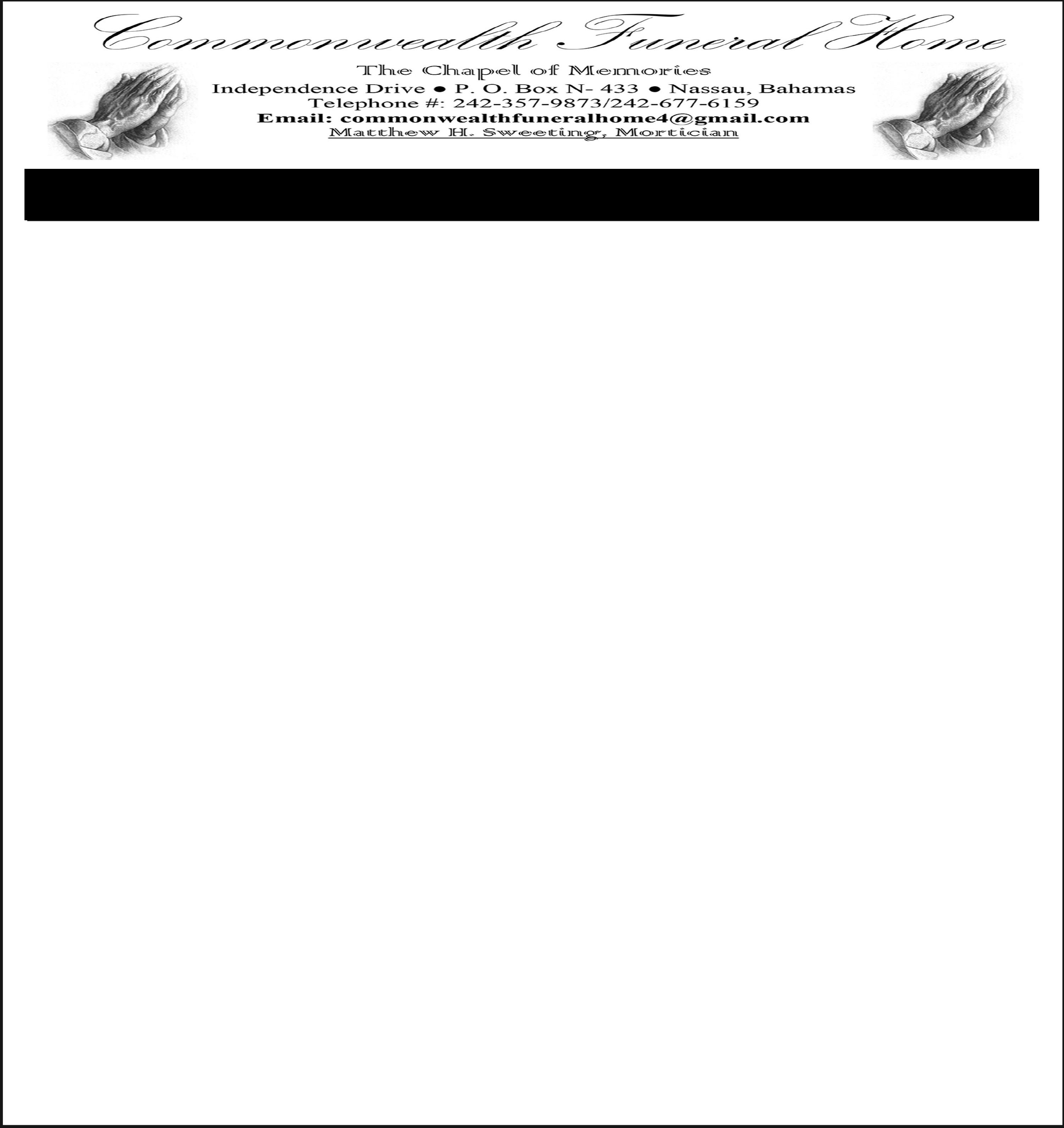 The body will repose at the Chapel of the Saints, Sweeting’s Colonial Mortuary, #54 Blue Hill Road, New Providence on Friday from10:00am to 5:00pm and on Saturday at the church from 9.:00am until service time.