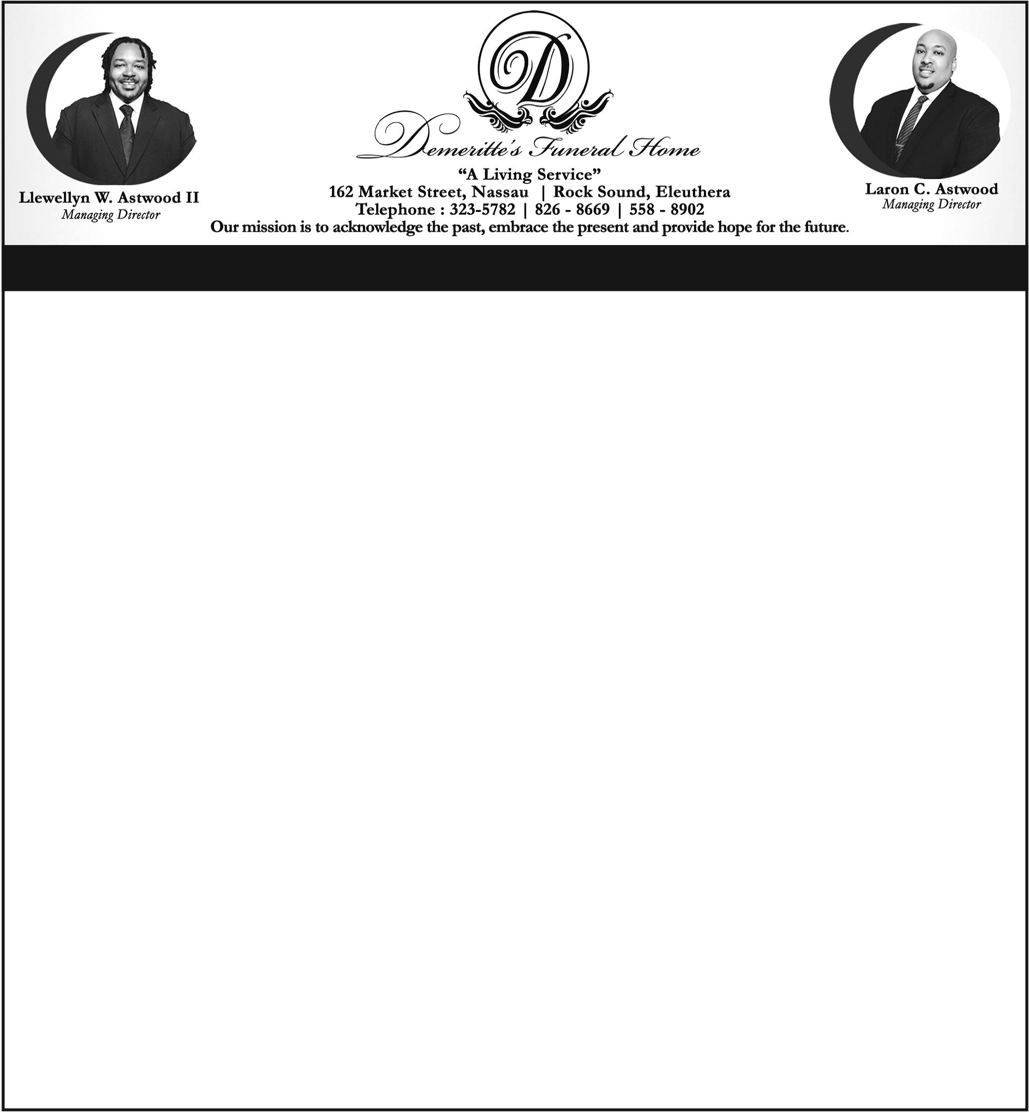 Shirley She leaves to carry on her legacy are her daughters: Princess Hepburn, Sharlese Blatch and Shanny Roberts; grandchildren: Breanna Blatch, Demico Gardiner, Ian, Yahshua, Jamarion & Jamaranique Demerritte, Jayson Roberts, Zakyri Blatch; great grandchild: Dariana Blatch; brothers: J Alexander Blatch Retired Supt. RBPF and Wellington Blatch; sisters: Florie Rolle, Sheila McKenzie and Linda Rolle; nephews: Antoine, Jackson, Michael, Bobby Blatch & Kristin Moxey-Blatch, Michello Blatch, Ashton Blatch, Marvin Johnson, Romeo Rolle, Alex, Omar & Oneil McKenzie, Olgan Moss; nieces: Lyndah Jo Oswald-Greene, Freeda Eugene-Fullerton, Olivia Blatch, Reenae Dominic-Roache, Melissa Levar-Williams, Stephanie Blatch, Kizzy & Kimberly Rolle, Nikita McKenzie, Lisa Allen, Vanessa Stuart, Charlynda Cartwright, Katie & Kathlyn Blatch; grand nephews and nieces: Adina Blatch, Whyette, Lynique Greene, Kelissa & Lavar Jr. Williams & Diana Blatch, Naomi Mocey-Blatch, Raquel, Andrew, Teanna, Deja, Carllum & Amari Blatch, Michello Jr. & Samiyah Blatch, Lachea & Omar McKenzie Jr., Aiyshia & Aiyana Allen, Ashli Stuart, Dani-Lynn Cartwright, Shayann, Marcus & Shadonya Johnson, Tarizma Rolle, Danageo, Trayvon & Demarcus Rahming, Tybreon Rolle, Wynta Miller, Romeo Jr. & Ramon Rolle, Omari, Omair & Onyx Moss, D’nae Starr, Ledgen Roache; special thanks: the Blatch Family, the Butler Family, the Jones Family, the Stubbs Family, the Forbes Family; other relatives including: the Newtons, Bastians, Sweetings, Blacks, Knowles families.