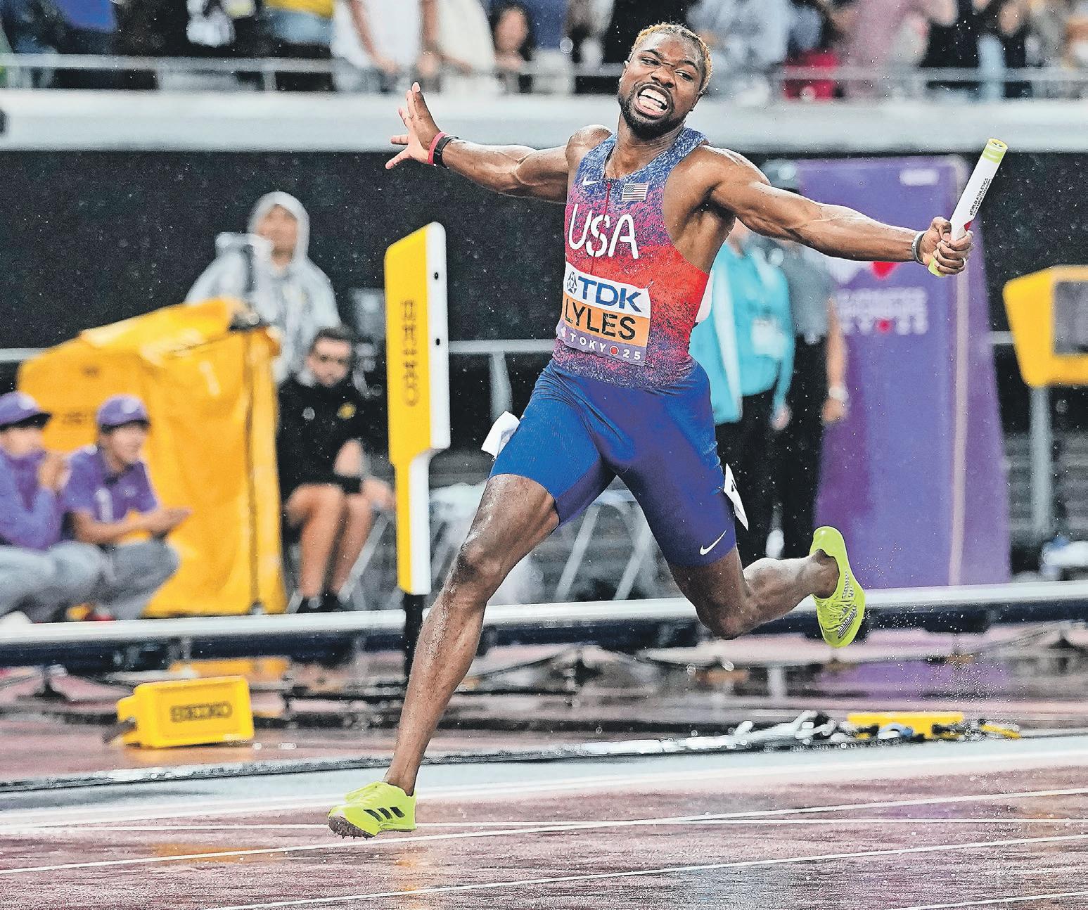 NOAH Lyles crosses the finish line to win the men’s 4 X 100 metres relay at the World Athletics Championships in Tokyo, Sunday, September 21, 2025. (AP Photo/Matthias Schrader)