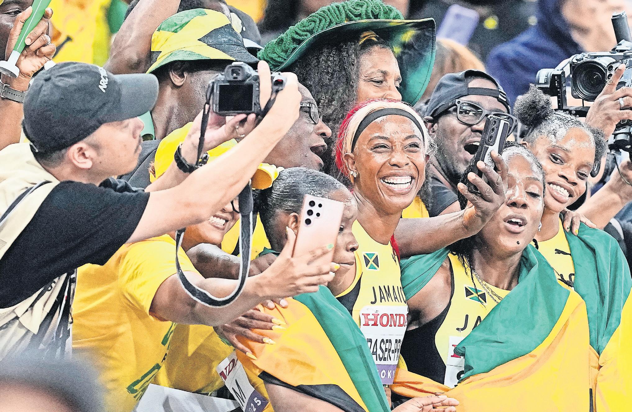 JAMAICA’s Shelly-Ann Fraser-Pryce and her teammates celebrate with supporters after taking the silver in the women’s 4 X 100 metres relay final at the World Athletics Championships in Tokyo, Sunday, September 21, 2025. (AP Photo/ Petr David Josek)