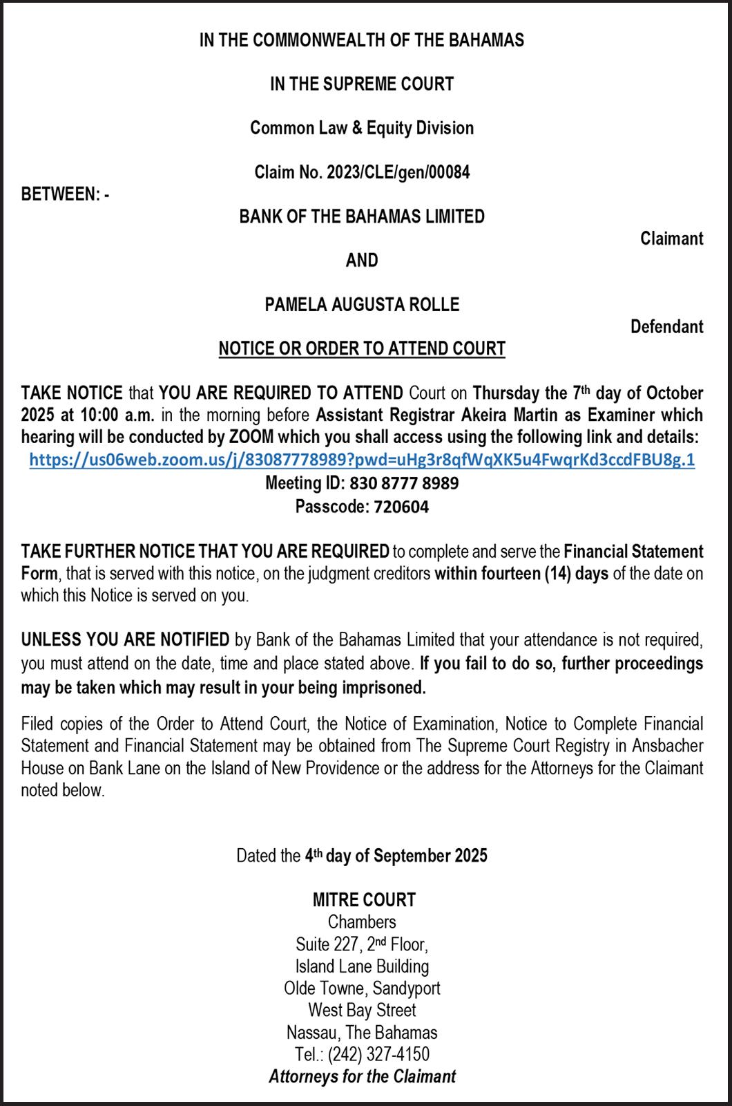 NOTICE is hereby given that ROSEKEVA PASCAL of Quarry Misson Road, Nassau, The Bahamas, is applying to the Minister responsible for Nationality and Citizenship, for Registration/ Naturalization as a citizen of The Bahamas, and that any person who knows any reason why registration/naturalization should not be granted, should send a written and signed statement of the facts within twentyeight days from the 16th day of September 2025 to the Minister responsible for nationality and Citizenship, P.O. Box N-7147, Nassau, New Providence, The Bahamas.