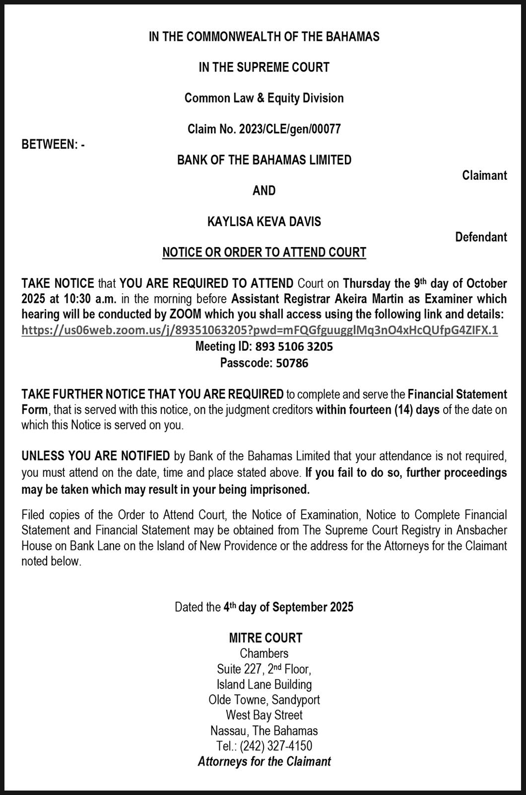 NOTICE is hereby given that MADLYNE FILS-AIME of P. O. Box SS-6582, Fowler Street, New Providence, Bahamas is applying to the Minister responsible for Nationality and Citizenship, for registration/ naturalization as a citizen of The Bahamas, and that any person who knows any reason why registration/naturalization should not be granted, should send a written and signed statement of the facts within twentyeight days from the 23rd day of September, 2025 to the Minister responsible for nationality and Citizenship, P.O. Box N-7147, Nassau, Bahamas.