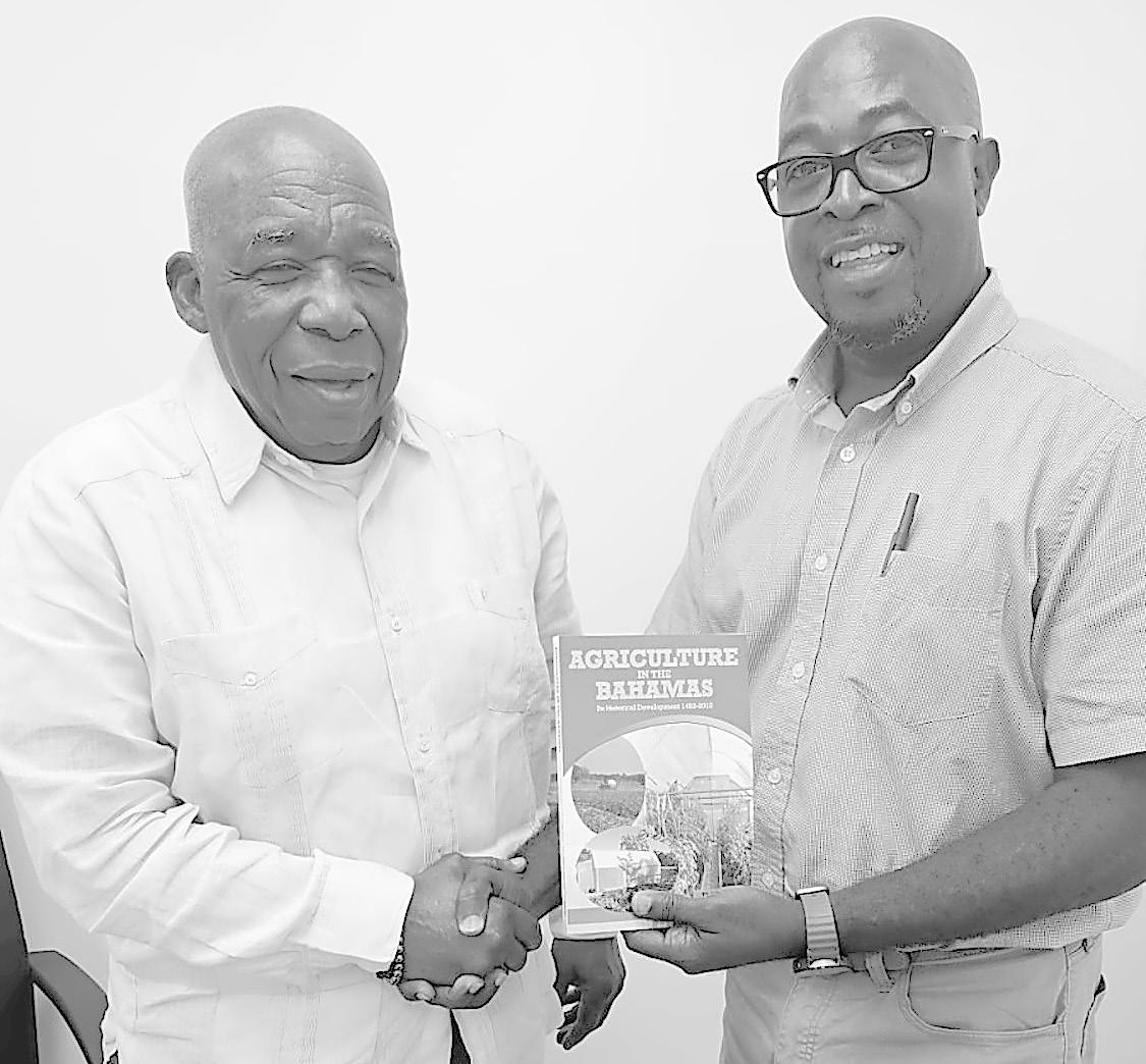 Valentino Munroe, its present executive chairman, met with Dr Godfrey Eneas, now chairman of the Bahamas Centre for Food and Nutrition Security. The discussions were described as both fruitful and forward-looking. The duo placed strong emphasis on how research, innovation and partnerships can strengthen the nation’s food systems and reduce The Bahamas’ heavy dependence on food imports — a matter the Government has identified as a high priority. Dr Eneas also presented Mr Munroe with a signed copy of his book, Agriculture in The Bahamas: Its Historical Development 1492–2012. Also present at the meeting were Dr Raveenia Roberts-Hanna, president of BAMSI, Carl Smith, Leslie Minns and Shomekhan Cargill, who lent their expertise to the exchange of ideas.