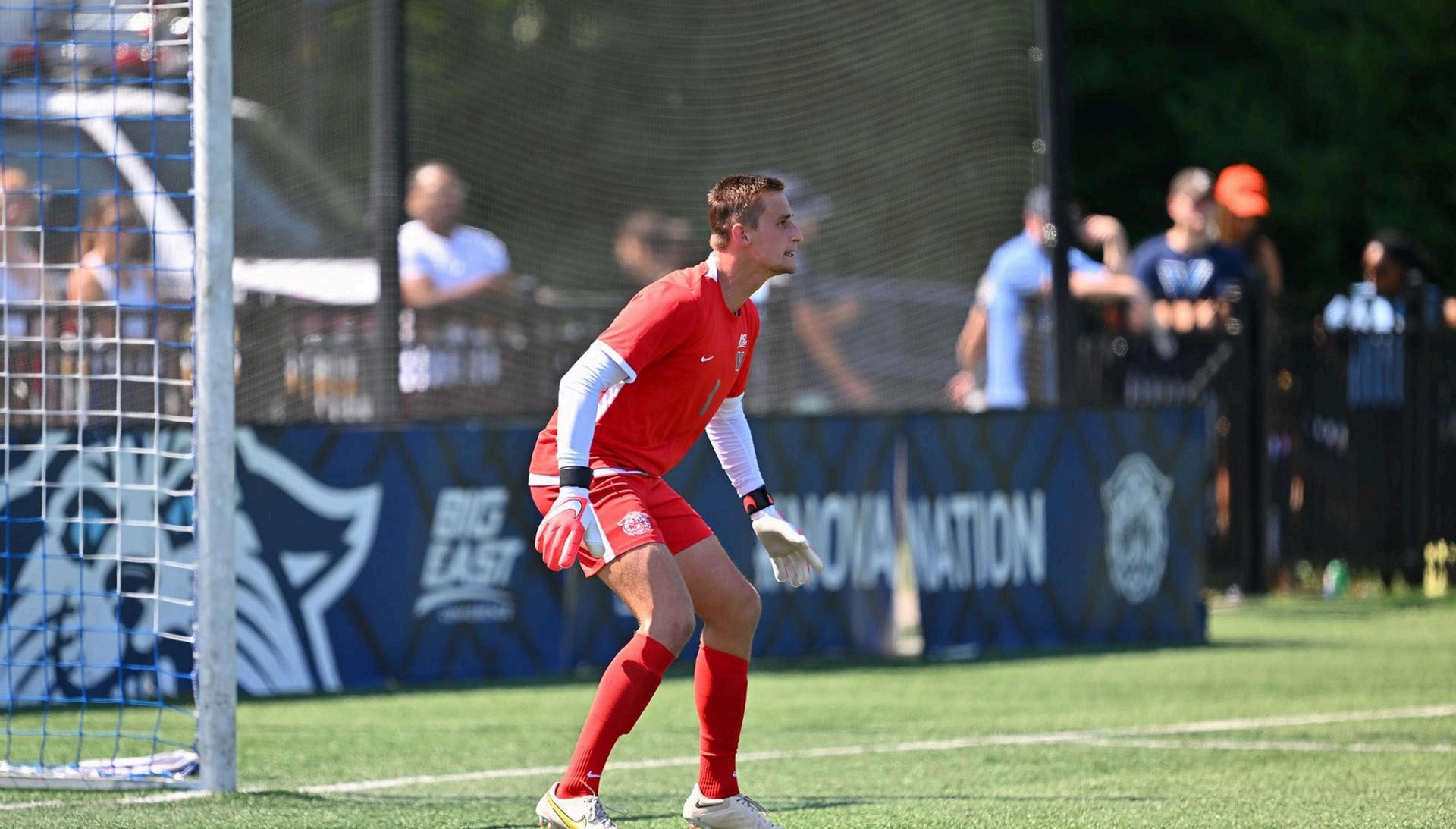 Graduate keeper Kent Dickey made four saves in the draw with FDU. Courtesy of Greg Carroccio / Sideline Photos via Villanova Athletics