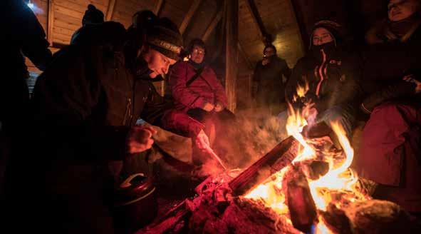 On cold winter nights or during nature based experiences in the daytime, you can warm up in one of our lavvu tents. Sitting on a warm reindeer skin on a wooden bench beside the open fire, you will quickly warm up and get new energy for your next adventure. This also adds an exciting dimension to the overall experience.
