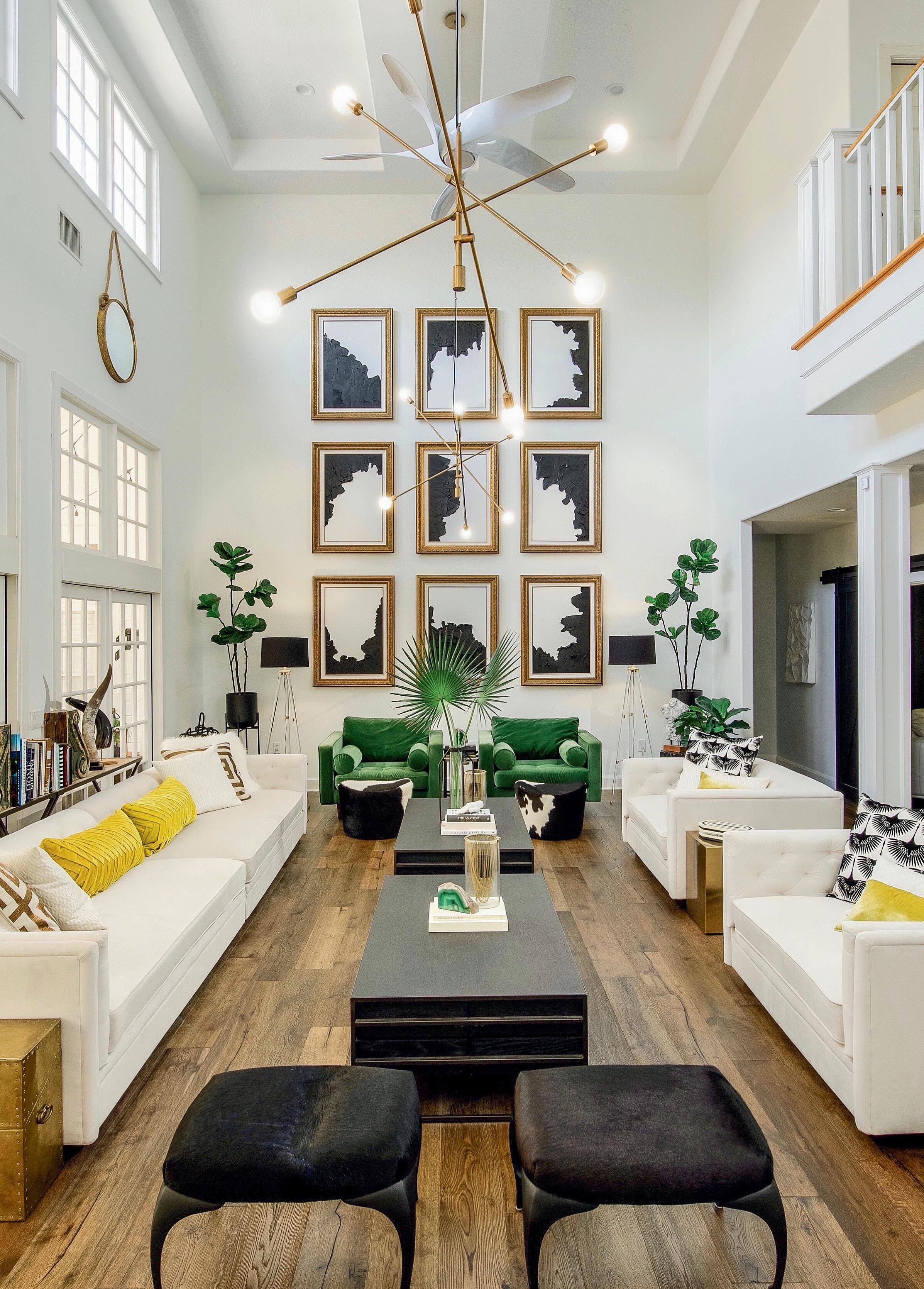 The challenge in rooms with ceilings as high as this, 22 feet, is what to do with the massive amount of wall space. “If you put a lot of complicated artwork up to the ceiling, it’s exhausting. It doesn’t give the eye a place to rest,” Chorniak said. “It’s best to look at abstracts instead of trying to focus on tiny details.” Instead of hanging landscapes or family pictures, Chorniak made nine simple black-and-white pieces out of drywall compounding and framed them in vintage-style frames from Hobby Lobby. The long sofa on the left is actually a sectional from which the corner pieces were removed and the longer pieces attached side by side. It is covered in an easily cleanable polyester velvet in white because “the darker the furniture, the more visual space it takes up,” Chorniak said. “You don’t want to feel like there’s a truck parked in the room.” Two of the chairs are green: “I think green is absolutely important in a room. It adds earthiness and brings the outdoors in.” She kept the lighting simple and modern, and hung round mirrors up high to reflect the light.