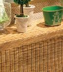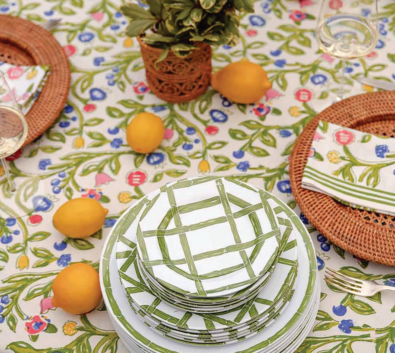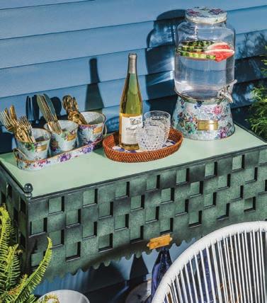 We love how the designer in the room to the left repurposed a cabinet as a bar. The bright pop of color makes this sunroom feel so bright and cheery – even with the navy backdrop! Surrounded by loungers, this space feels like the perfect spot for relaxed conversation and great drinks. Wall-mounted bars are a great option for tight courtyards and patios. The MacKenzie-Childs stylists actually flipped a planter box upside-down to make the bar below! It’s an adorable look that doesn’t take up a ton of space.
