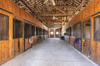 This two-story farmhouse features a 13-stall horse barn, a large, covered lunging arena, a outdoor arena, a tobacco barn, housing for 2 employees, 10 paddocks and 4 fenced-in fields!