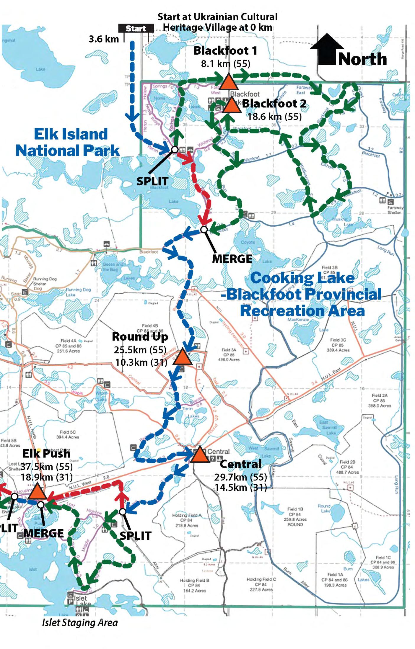 All Long Course Events, 55 km and 31 km, will start just south of the Red Barn at the Ukrainian Cultural Heritage Village (UCHV), 50 km east of Edmonton on HWY 16, and finish at Waskahegan Staging Area in the Cooking Lake-Blackfoot Provincial Rec Area.