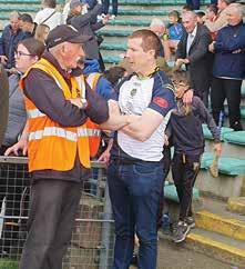 legendary former Lixnaw hurler Sean Flaherty with programme sellers Gavin O Connor and Joe Walsh from Kilmoyley also Tom Lawlor from Ballyheigue at Austin Stack Park on Sunday. Photo Moss Joe Browne.