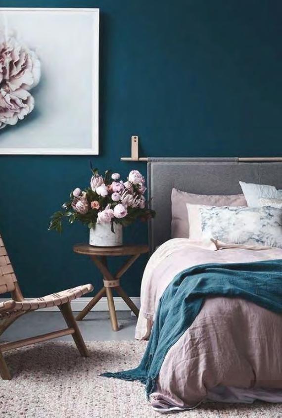 Combining warm and cool tones is another way to add life to your home décor this winter. Teal color creates a statement in any interior design and makes it look elegant when you combine it with softer hues. The use of dusty pink and pearl gray in the bedding, area rug, and piece of wall art is adding depth to this design. You can choose Valspar’s bold midnight blue tone—Everglade Deck— to create the look.