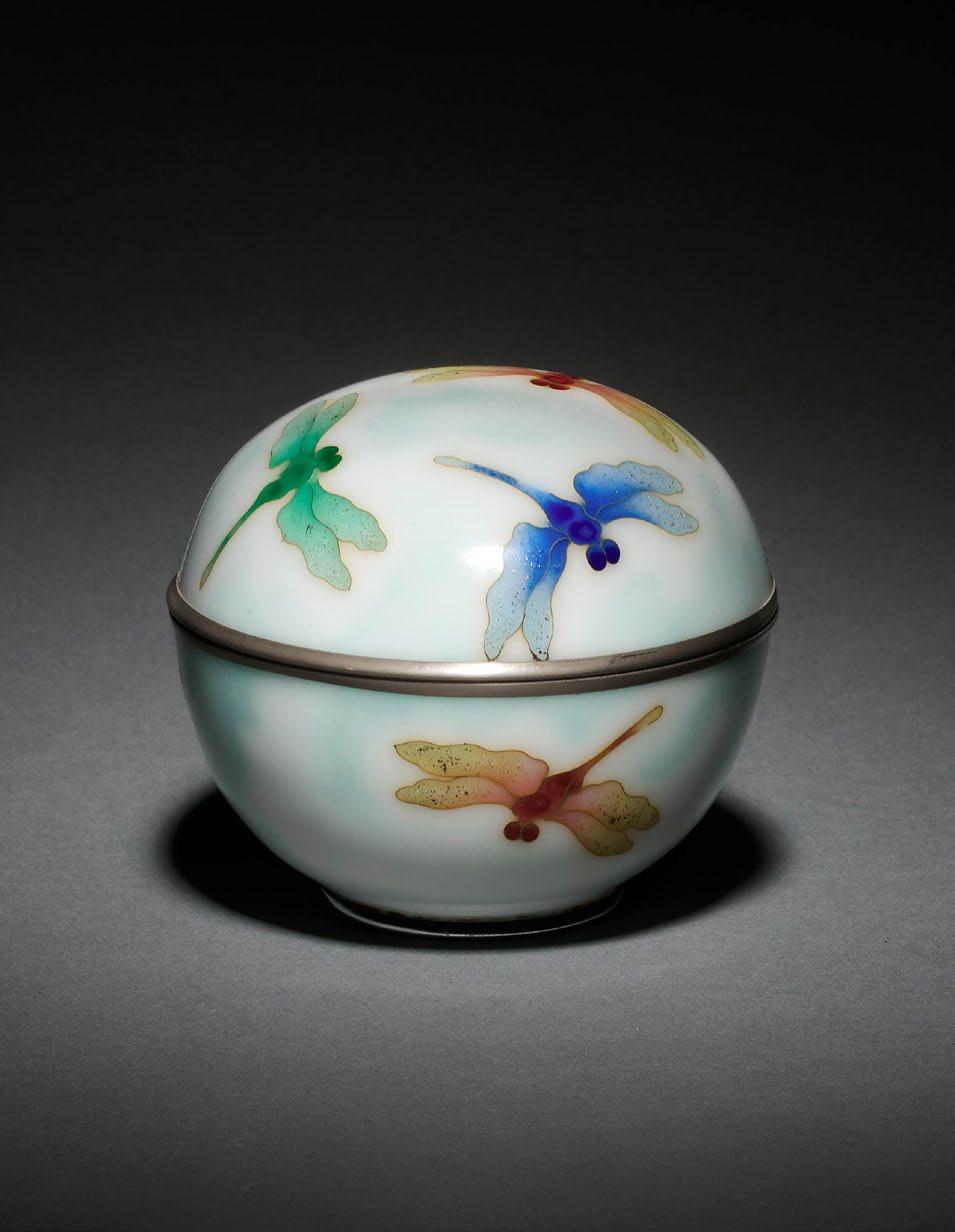 An exquisite enamel box decorated overall with dragon flies in a kaleidoscope of colours, with silver mounts. inlaid Ando mark.