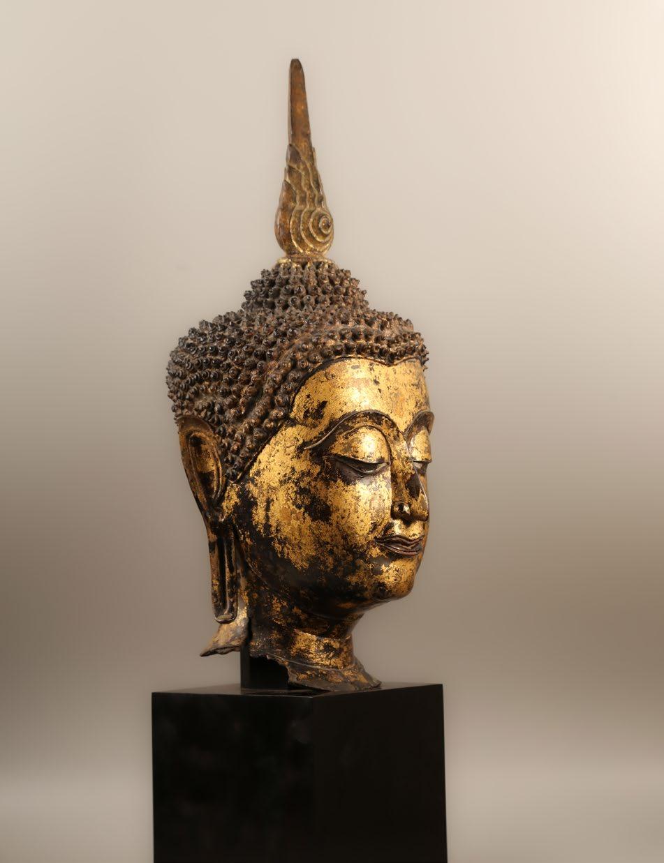 this beautiful sculpture from the Ayutthaya Kingdom period in thailand depicts a Buddha head recognizable by the characteristic elements of the Great Man, or lakṣa a: his serene expression and fine features, the flame rising above the ushnisha. A superb and incredibly wellpreserved golden patina covers almost the entire face of the Buddha. it is also interesting to note the very good preservation of the entire earlobes stretching on either side of his face. his hair is stylized in multiple curls whose relief is notable.