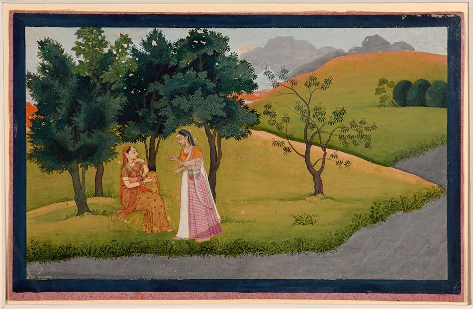the present painting is an illustration of the court poet Keshav Das' love poem, the Rasikapriya. Composed in 1591 for his patron, the Raja of Orchha, Das' popular treatise explores the notion of ideal lovers. these narratives feature Radha and Krishna as the nayika and nayak (heroine and hero). This scene, identified as folio number 266, centers the beauty of Radha.