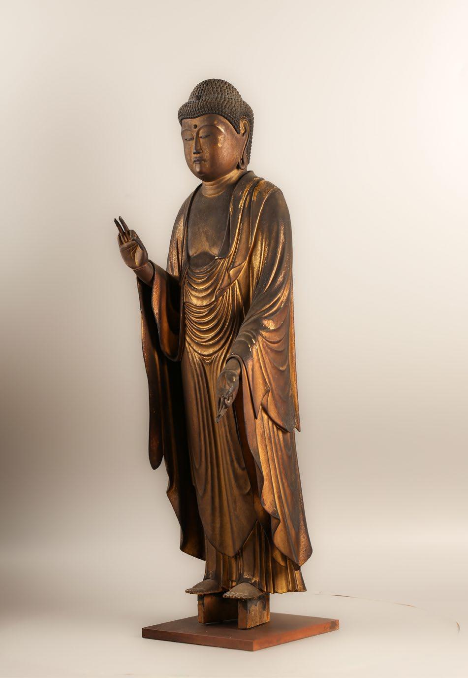 ,this gilded wooden sculpture depicts Amitabha (Amida in Japanese) standing in a delicately folded robe. the right arm is raised and the left arm is extended, the index finger and thumb of each hand forming a circle representing the mudra of the teaching, welcoming the believer into the Land of bliss, over which he rules.