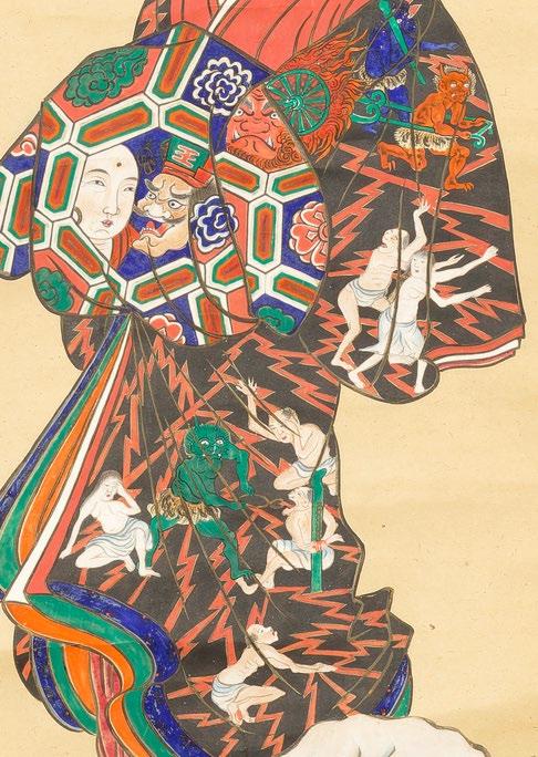 the Jigokudayu 地獄大夫 (hell Courtesan) is depicted proudly standing attired in her vivid kimono. the kimono is decorated with images from hell; Enma (King of Hell) and Jizo (the guardian of children, travellers and the underworld), oni demos and people tormented in hell, a carriage on fire (“Kataku no hito 火宅に人” parable) etc. the hair style of the courtesan is known as hyogo-mage 兵庫髷which is fashionably adorned with luxurious and very costly tortoise-shell (Bekko) hair pins.