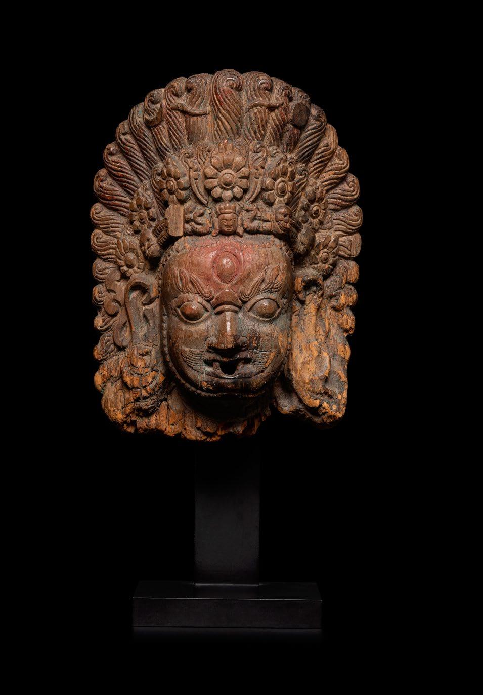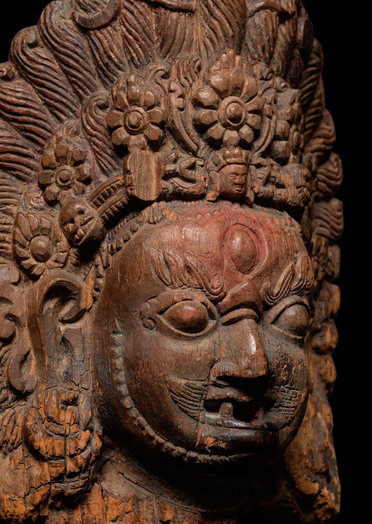 Carved from wood with traces of original pigment, the masks may have been used in festivals, temple rituals, or as a form of protection. Flaming hair and floral elements with small figures decorate the elaborate headdress around his face. The weathered surface and curved edges of the mask seem to point towards centuries of use, adding to its historical depth and spiritual significance as a relic of tradition.
