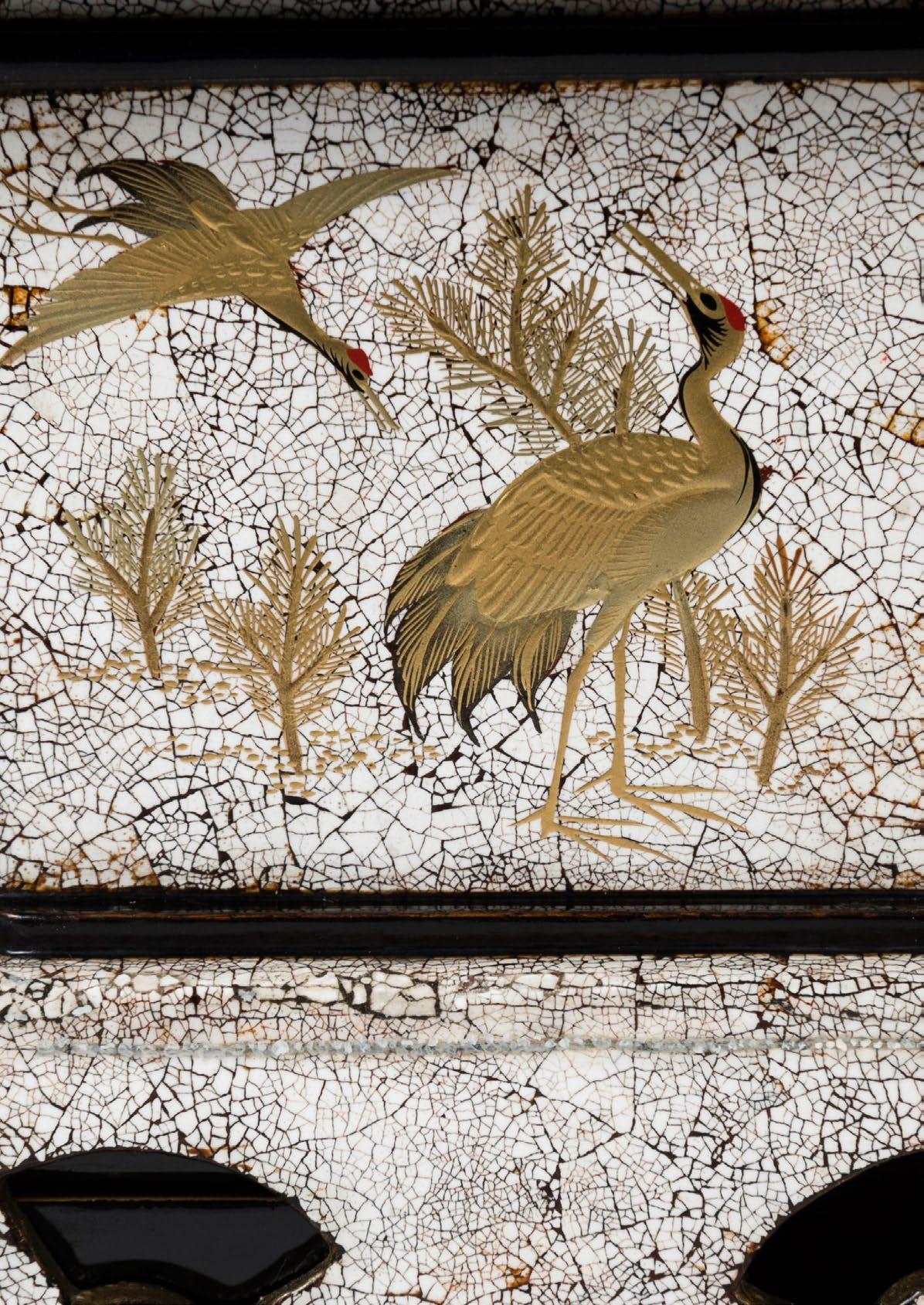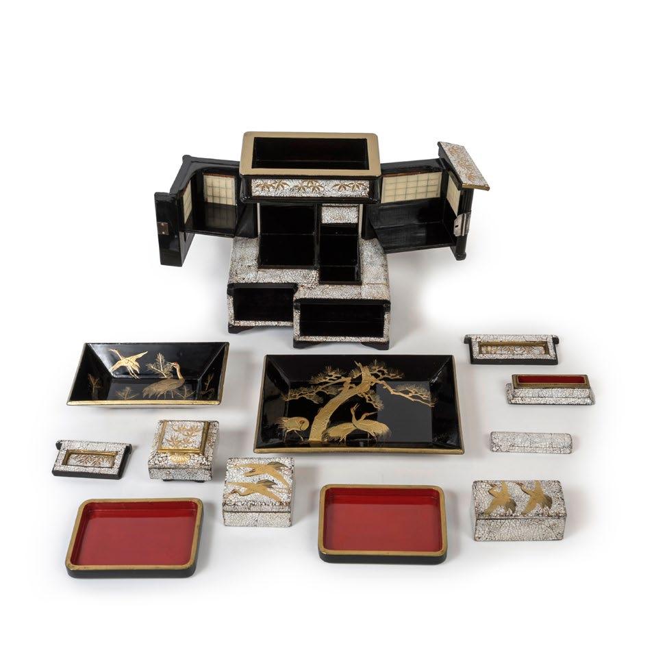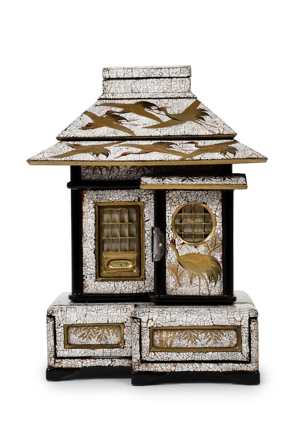 Lacquered on copper ground, decorated in gold hiramaki-e and silver togidashi-e, inscribed to the reverse 'Vue de Versailles'. 16 cm (h.) x 28,5 cm (w.)
