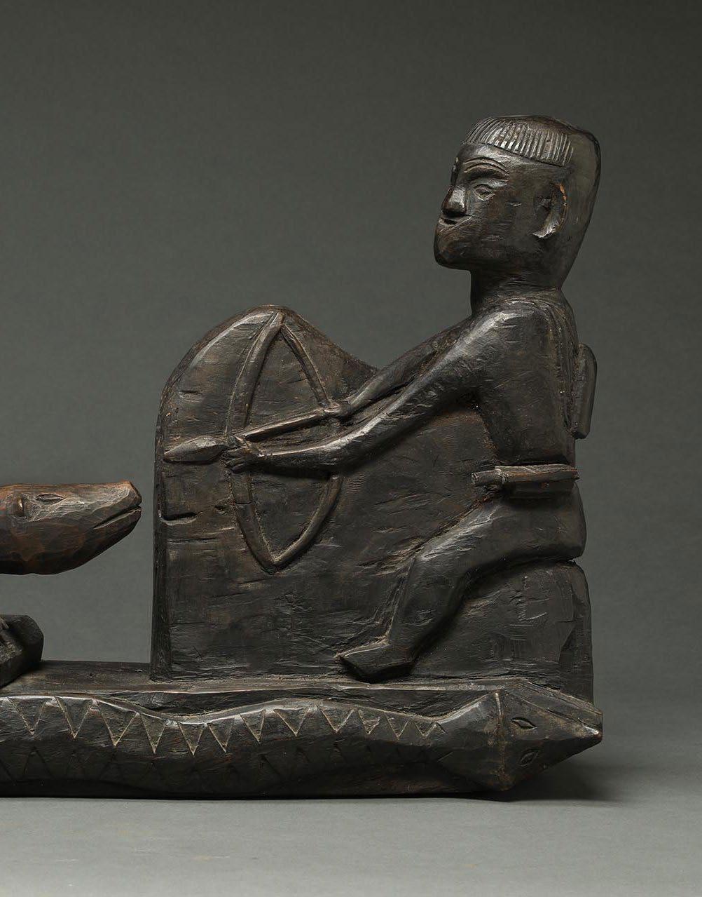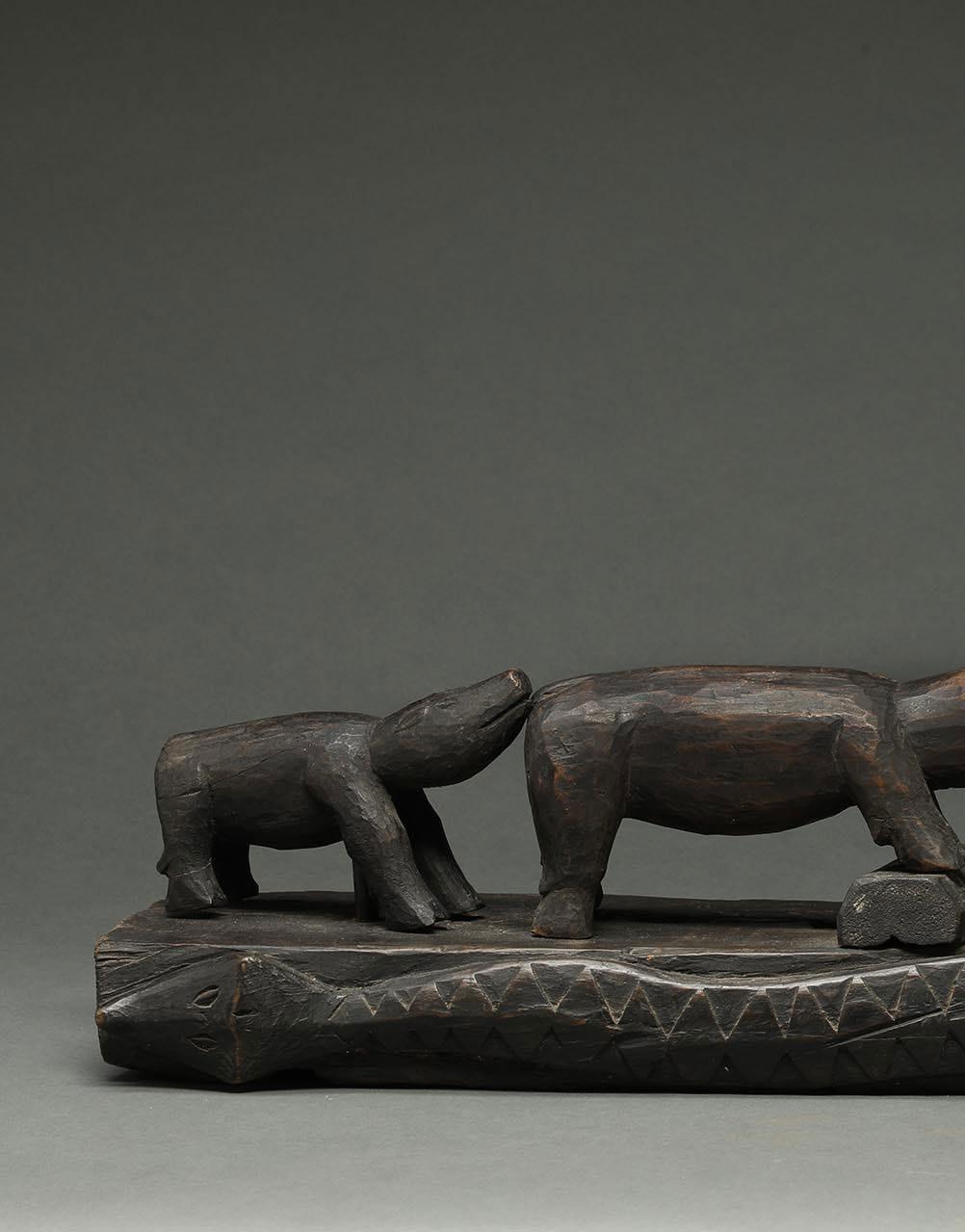 This sculpture group presents a narrative of an ancestral hunter with his dogs going after a pair of wild pigs, with the Paiwan totemic serpent circling along the base on both sides… Indigenous Taiwan tribes tended to sculpt more in a flat surface manner...on boats, beams, etc. Sculptures in the round like this are very uncommon.