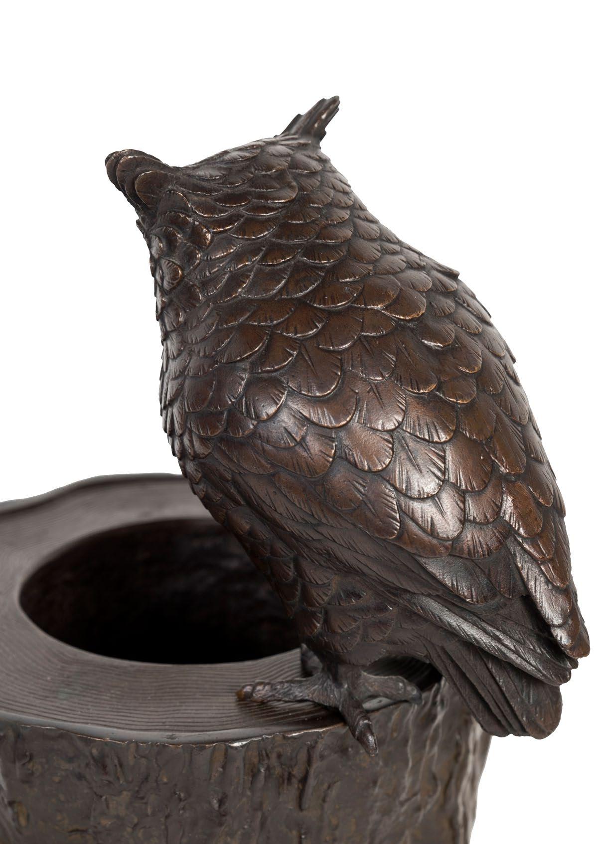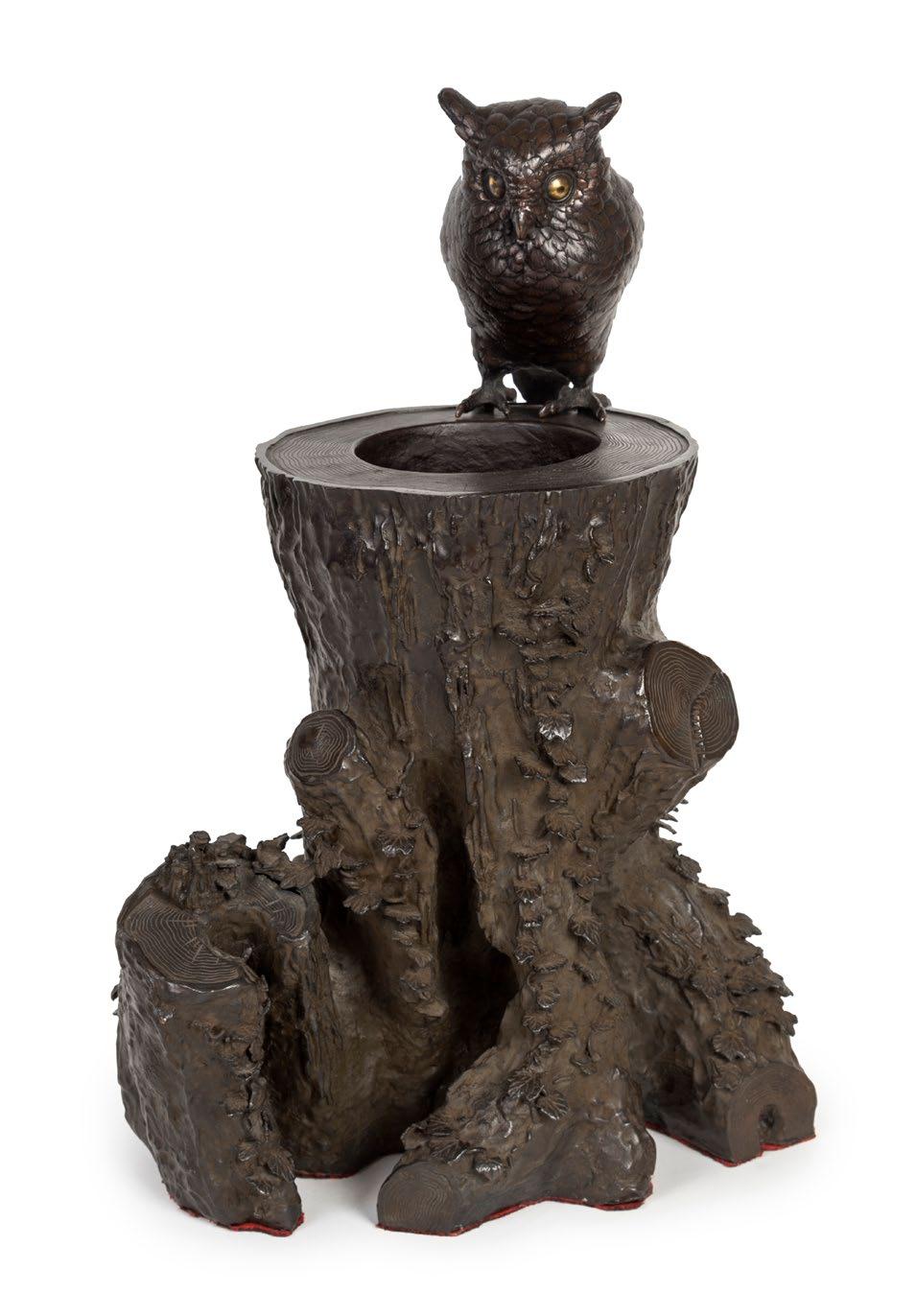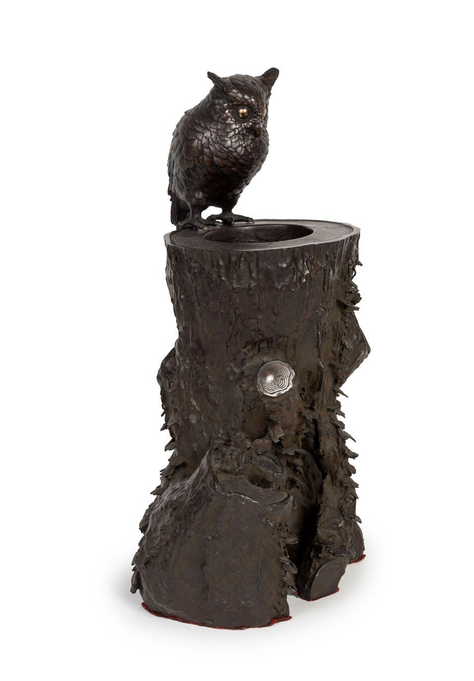 Bronze sculpture representing an owl on a tree stump covered with ivy. The owl, detachable from its base, has shakudo eyes. It is certainly an Ryûkyû scops owl (Otus elegans), present in the south of Japan in Ryûkyû Islands.