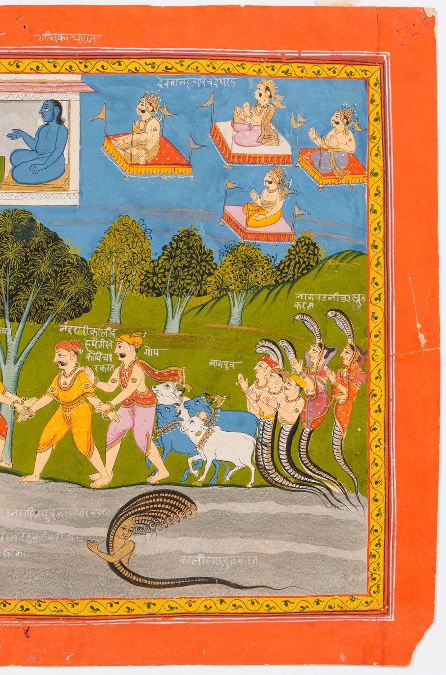 Created in the former kingdom of Datia around 1800, this paintings depict a pivotal episode from the Bhagavata Purana in which Krishna subdues the serpent king Kaliya, a multi-headed serpent (naga) seen on the lower right of piece. The scene unfolds along the banks of the Yamuna River, where Kaliya’s venom had poisoned the waters, endangering the health and lives of the region’s inhabitants. In response, Krishna leaps into the river to challenge the serpent’s many hoods, asserting his divine authority. The wives of Kaliya, depicted with serpent-like lower bodies on the upper left, beseech Krishna for mercy as they recognize his supreme power. Their pleas are met with compassion, and Krishna spares Kaliya, restoring purity to the river and harmony to the land.