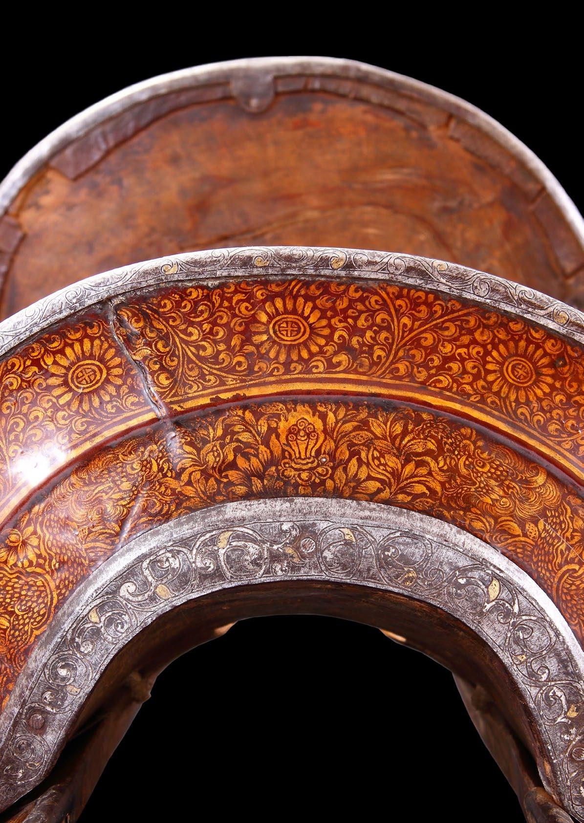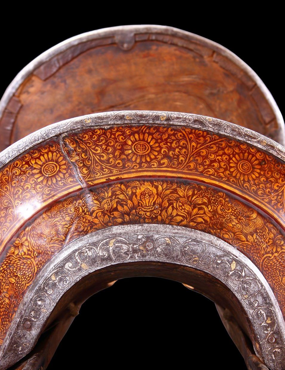 This saddle’s floral arrangements can be compared to a 17th-century Tibetan wooden box from a private collection that is illustrated in Wooden Wonders: Tibetan Furniture in Secular and Religious Life (Kamansky, 2004, p.64, cat. no.241), as well as those published in Warriors of the Himalayas: Rediscovering the Arms and Armour of Tibet (La Rocca, 2006, P.105, cat. no. 30). The latter exhibits the same lacquer-like effect, formed by layers of pigmented shellac followed by the gold leaf designs, another layer of shellac, and a final coat of tung oil glaze.
