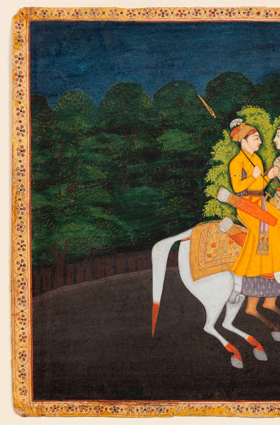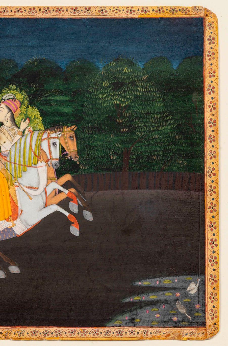 Baz Bahadur of Mandu, the last King of the Malwa Sultanate (r. 1555-1562), is depicted here riding with his beloved Rupmati on a pair of horses. They gallop in sync through the darkened night landscape, rearing up in perfect unison as the lovers gaze into each other’s eyes. They seem to glow with an otherworldly radiance, their energy illuminating the green bush behind them like a spotlit stage. A lotusfilled pond with a pair of birds bathing is depicted below.