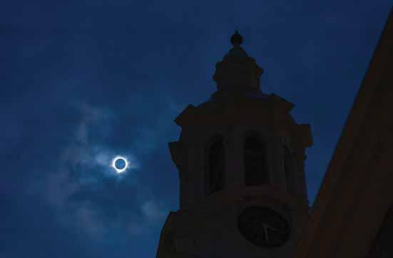All eyes were turned skyward— wearing the proper protective eyewear, of course—on April 8 for the once-in-a-lifetime solar eclipse. Buffalo was one of the locations in the path of totality. Hundreds of spectators gathered on South Campus to view the rare celestial event, which impressed despite cloudy skies. Photo: Douglas Levere.