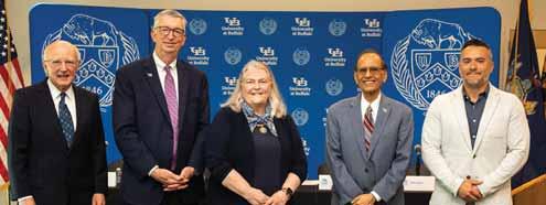 Left: Hauptman-Woodward Medical Research Institute will join UB, the two groups announced at a press conference in May 2024 at the Center of Excellence in Bioinformatics and Life Sciences. From left: Christopher Greene, HWI interim CEO; Provost A. Scott Weber; Connie Constantine, emeritus HWI board chair; President Satish K. Tripathi; and Sam Russo, HWI board chair. Photo: Meredith Forrest Kulwicki.