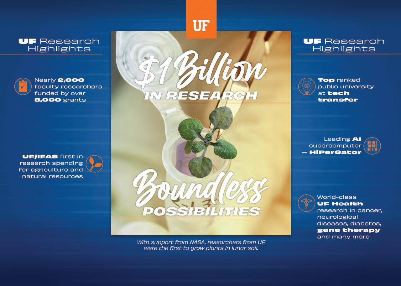 The University of Florida surpassed $1 billion in research spending in 2022, joining an exclusive group of only about a dozen public universities to reach that milestone. We’ve come a long way since our first grants of just a few thousand dollars from the National Science Foundation in the early 1950s, but while the scale is different, the goals are the same to make important discoveries about the world in which we live, translate these insights into relevance, and educate the next generation of scientists and scholars.