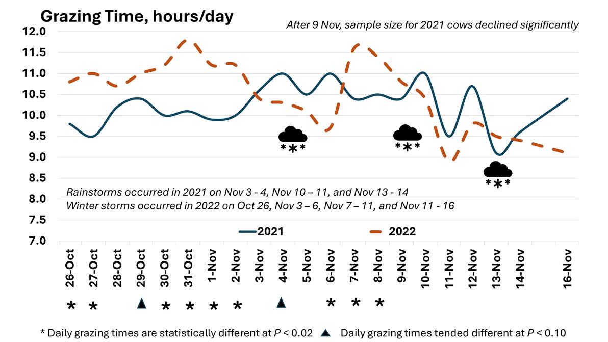 A study, Daily Behavior and Performance for Cows Engaged in Targeted Grazing in Southeast Idaho, found that substantial October rains caused increased greenness in 2021 and cows gained 0.7 lbs/day. In 2022, weather was more normal and cows lost 1.9 lbs/day. If a cow grazed one hour more/day in 2021, she gained an extra 0.4 lbs; but would lose an extra 0.9 lbs/day in 2022. The energy in the forage in 2022 did not compensate for the energy required to acquire that extra forage. Cows spent more time on south facing slopes and climbed higher in 2021 than they did in 2022. Except for days with winter storms, cows grazed longer in 2022, but it was a losing proposition. Targeted grazing on poor quality dormant season forage should include protein supplements to help prevent weight loss.