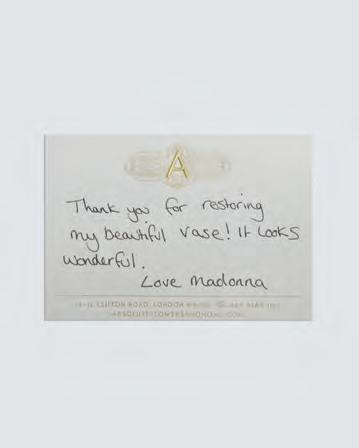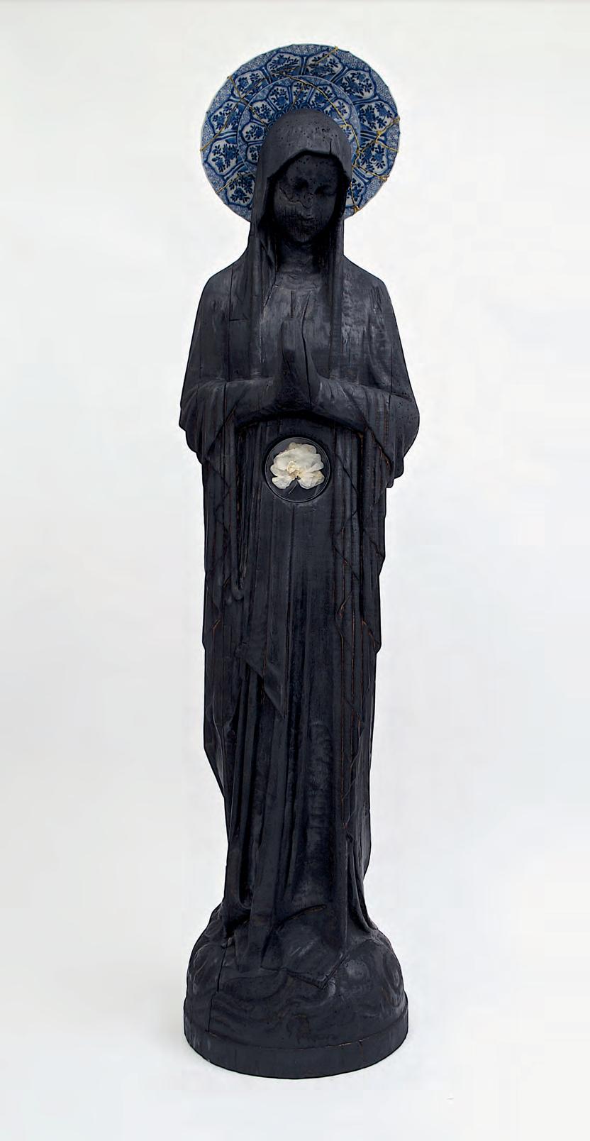 3 Layering, superimposing images and ideas onto each other, can be seen in the My Old Dutch (2025) series, where the original blue and white landscape has literally been obscured by the subsequent addition of multiple layers of white glaze. The ongoing engineering of the Dutch landscapes to mitigate flooding and reclaim land from the sea is central to the existence of the Netherlands and Dutch cultural identity. The misty shroud is like a palimpsest – presenting a partial view of the past and offering no clear answers for the future. Life is a mystery (2017) uses the title of a Madonna song to refer to both the Christian Madonna and the iconoclastic singer. The work also contains multiple layers of storytelling: Madonna gifted the preserved orchid, part of a massive bouquet of flowers, and accompanying thank-you note to express her gratitude for the restoration of an important artwork.