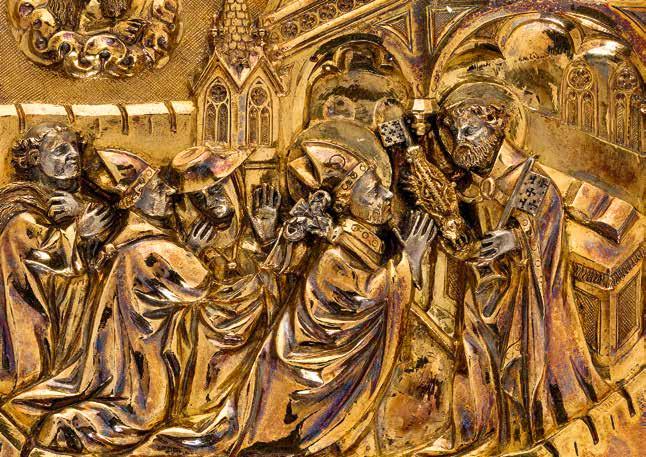 Anoniem, Servaas ontvangt de sleutel voor de hemelpoort van Petrus (detail), deel 2 van de Servatiusplatten (8 delen), 1403, verguld zilver, 10,7 x 13,8 x 2,5 cm. Museum für Kunst und Gewerbe, Hamburg