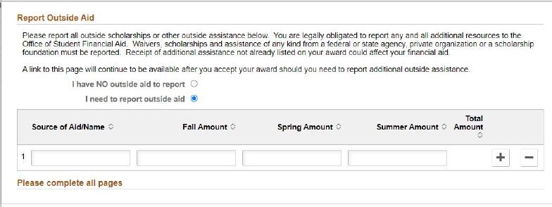 4. Enter the source of aid, name, and amount. If you have more than one source of outside aid, click the + button.