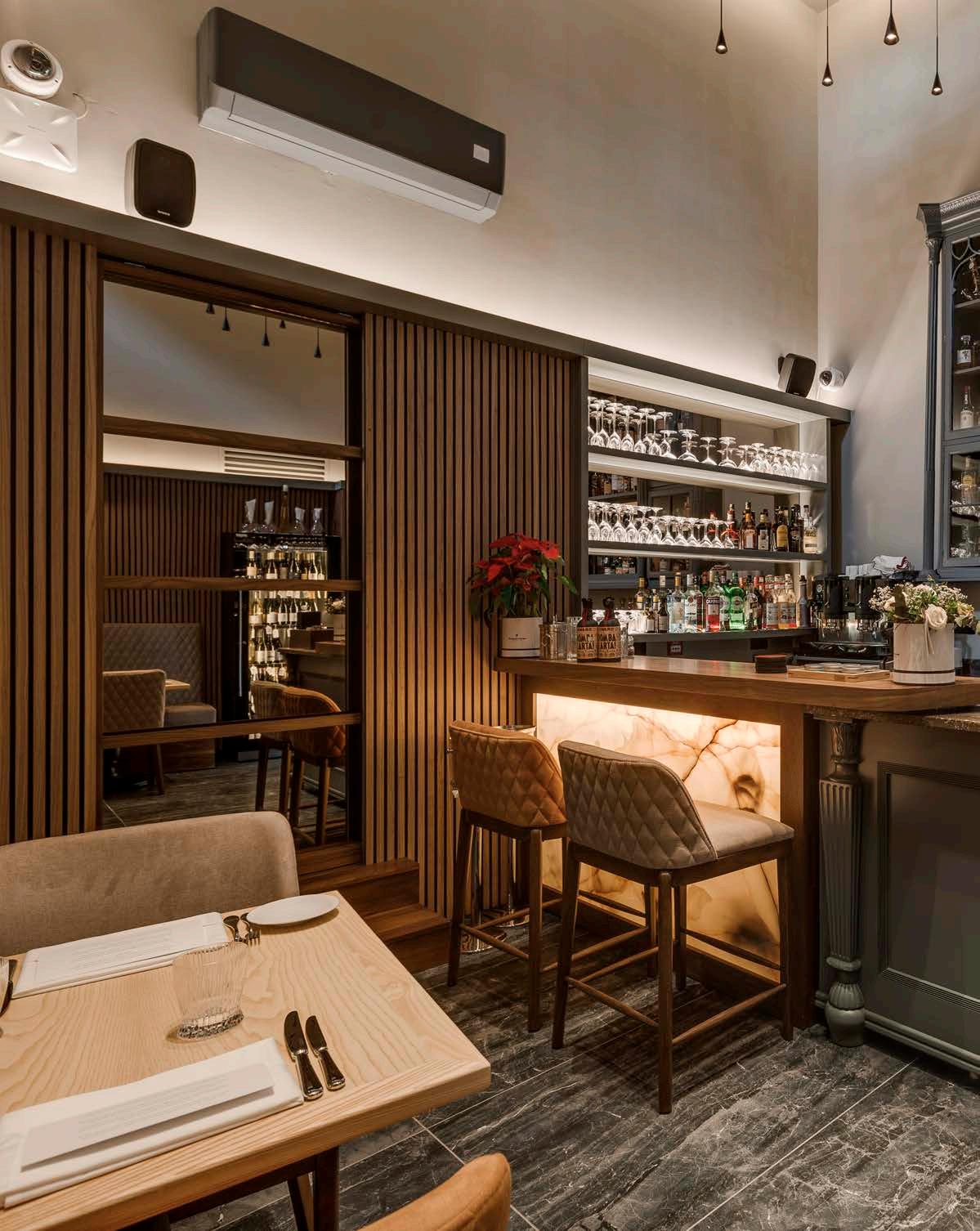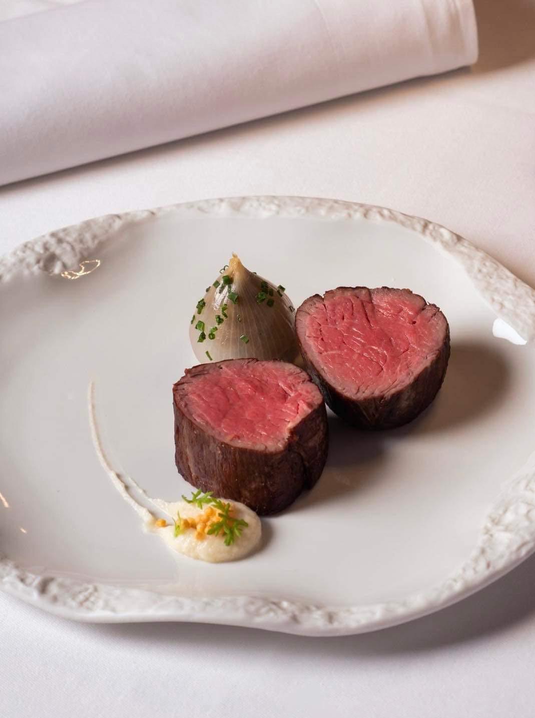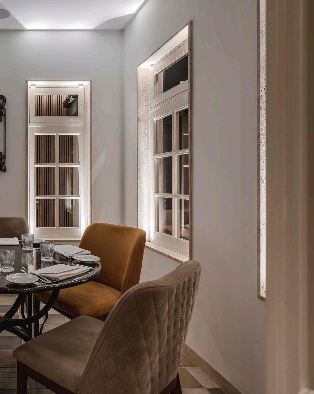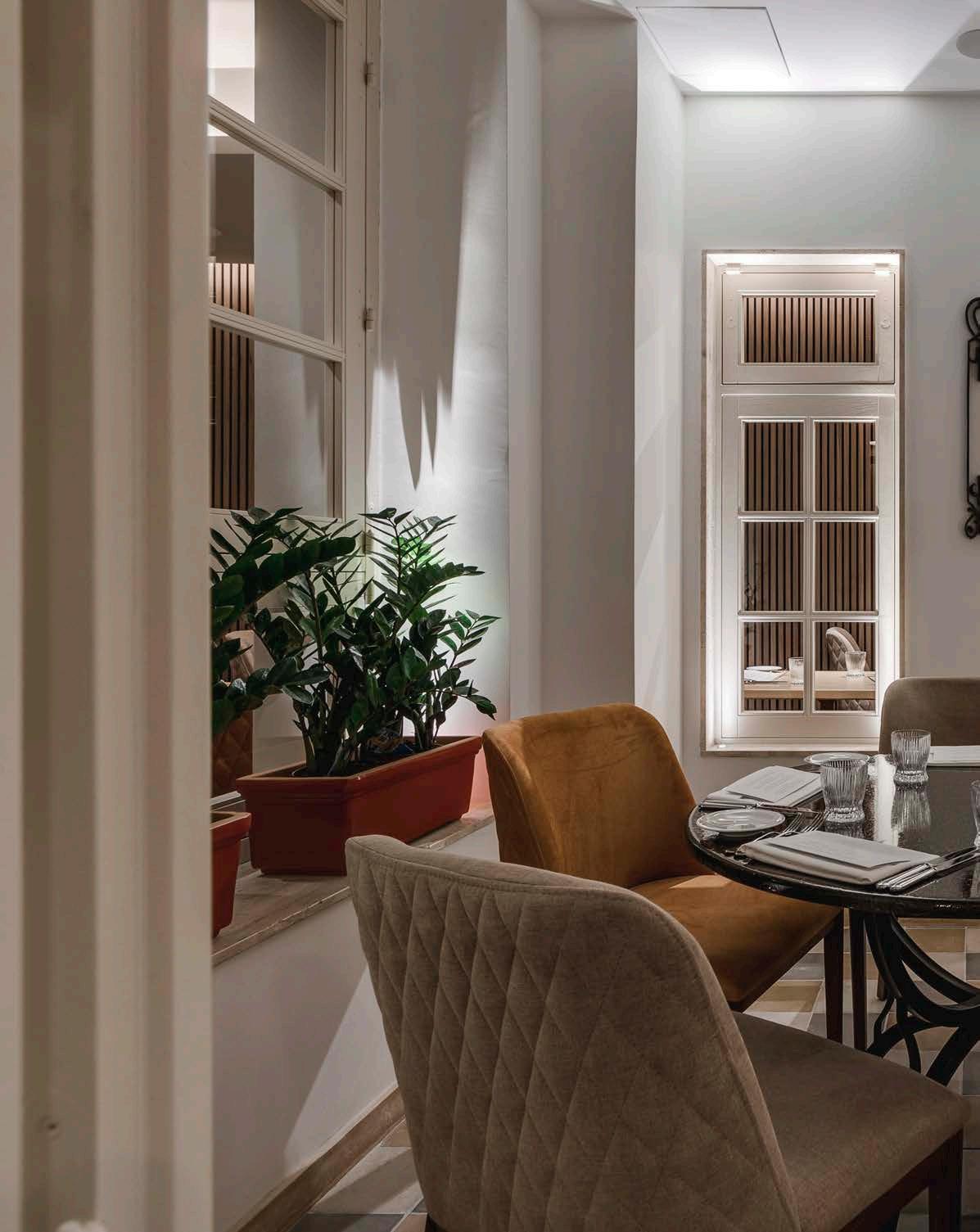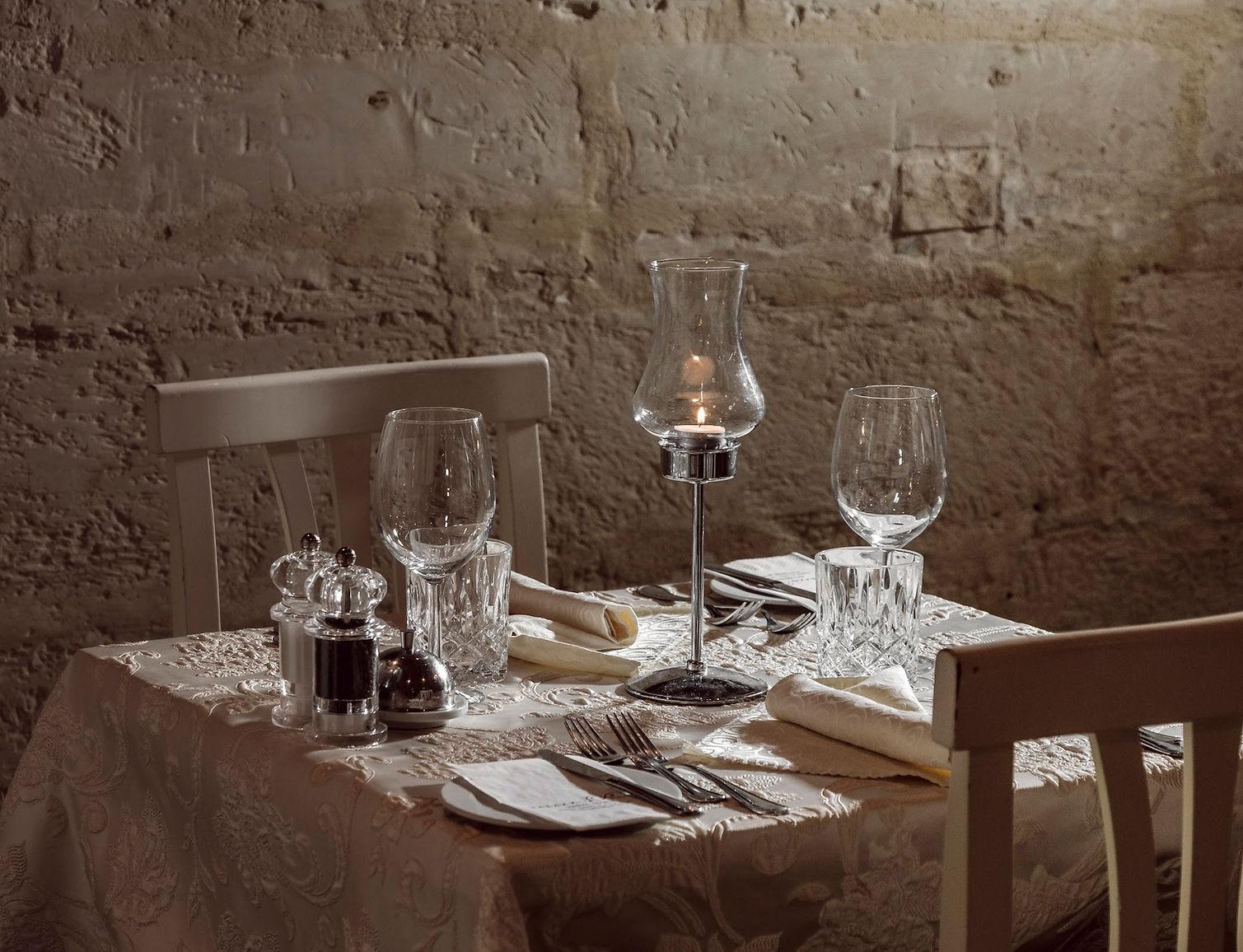 The restaurant hosts eight intimate tables in secluded elegance under lofty, cross-vaulted arches.