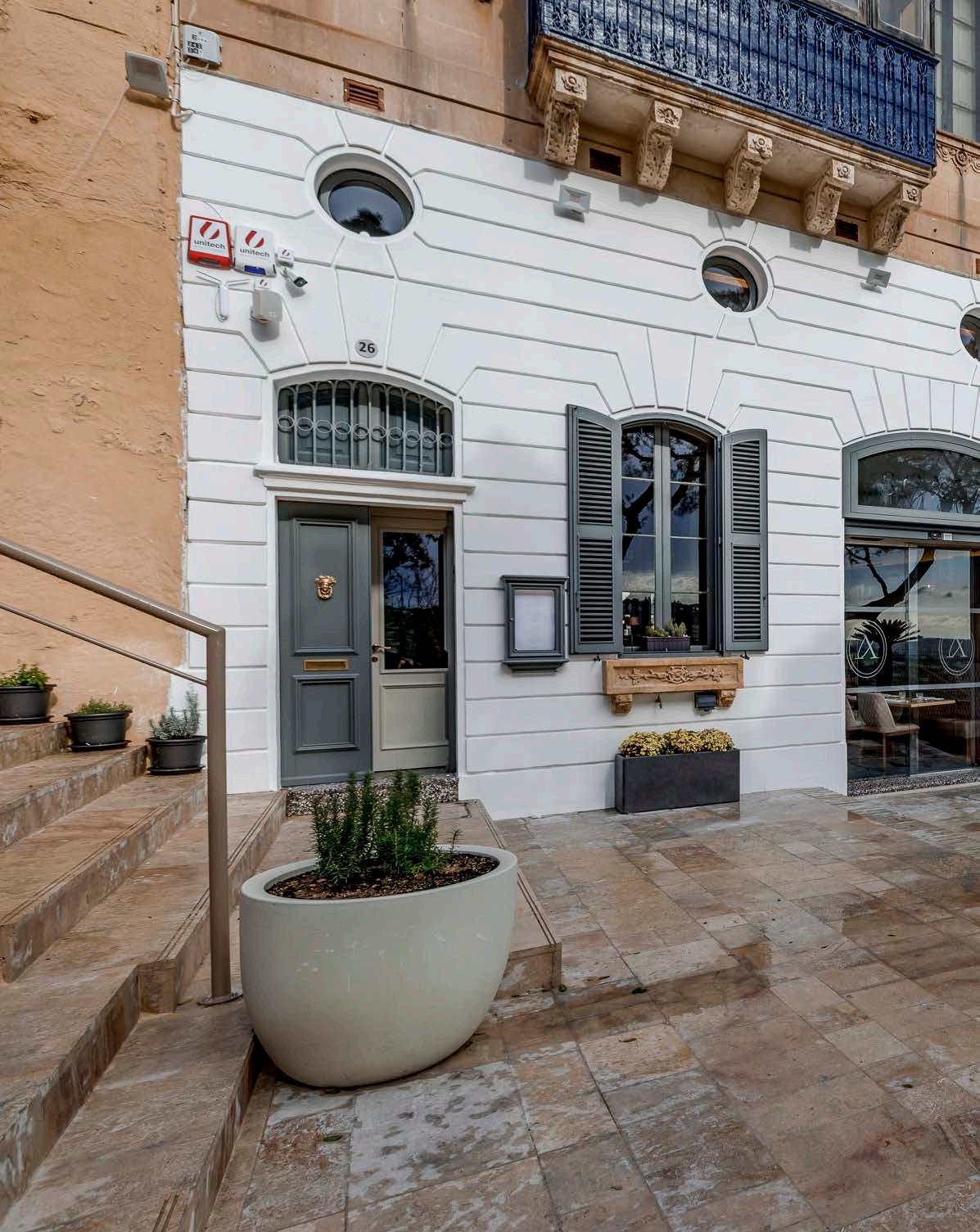 The Terrace at Rampila is on the original gun emplacement overlooking the defensive ditch and the entrance to the City of Valletta. The position, completed in 1582, was connected with the Cavalier of St. John and was designed to be pivotal part of the defence of the city against attacks from the land. Together with the Cavalier of St. James, facing from the opposite side of the Bridge, the fortifications commanded the approaches to Valletta.