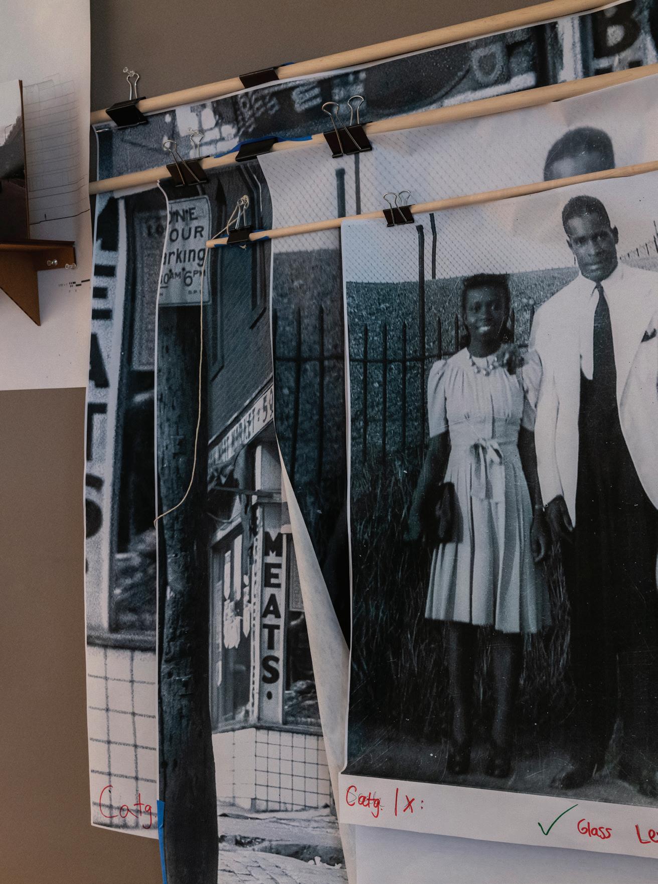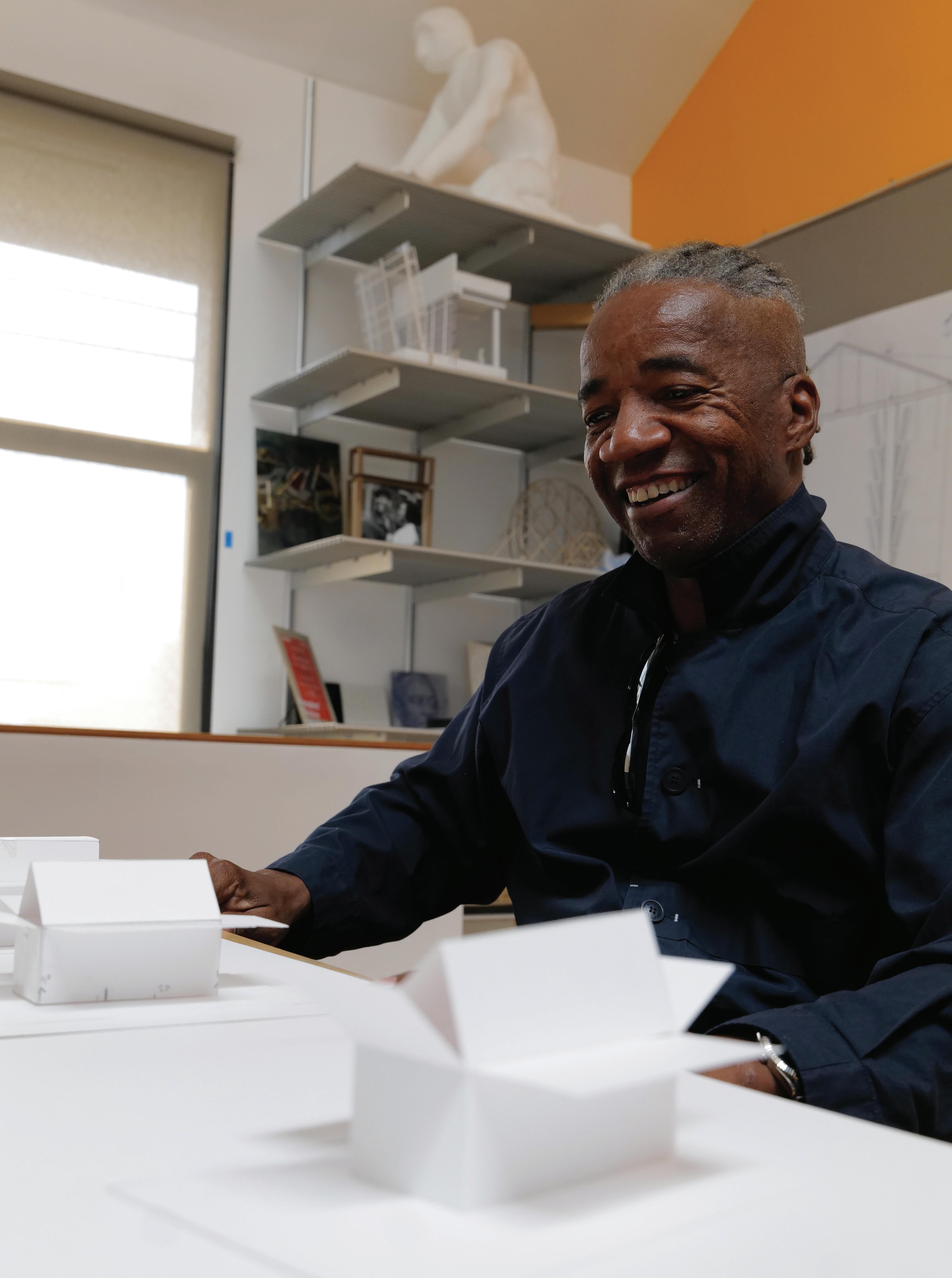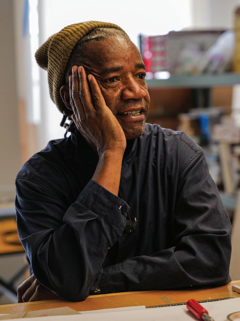 Studio’s ruby red door, a funky vintage doorknocker beside it. It’s all good inside, too, where on the studio’s first floor five or so associates are busy fine-tuning details of current landscape design and art installation projects, including an ode to the shotgun house vernacular for a Jacksonville, Florida, commission commemorating the Johnson Brothers’ home site where the Black national anthem, “Lift Every Voice and Sing,” was written. “I call this reflective nostalgia; we’re not re-creating a shotgun house, but reflecting on it, designing a memory device to activate the space,” explains Walter Hood, the studio’s founder.