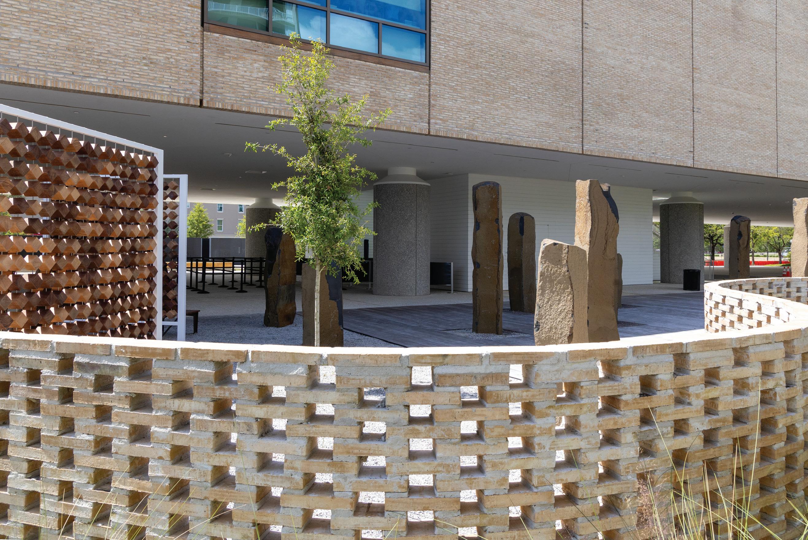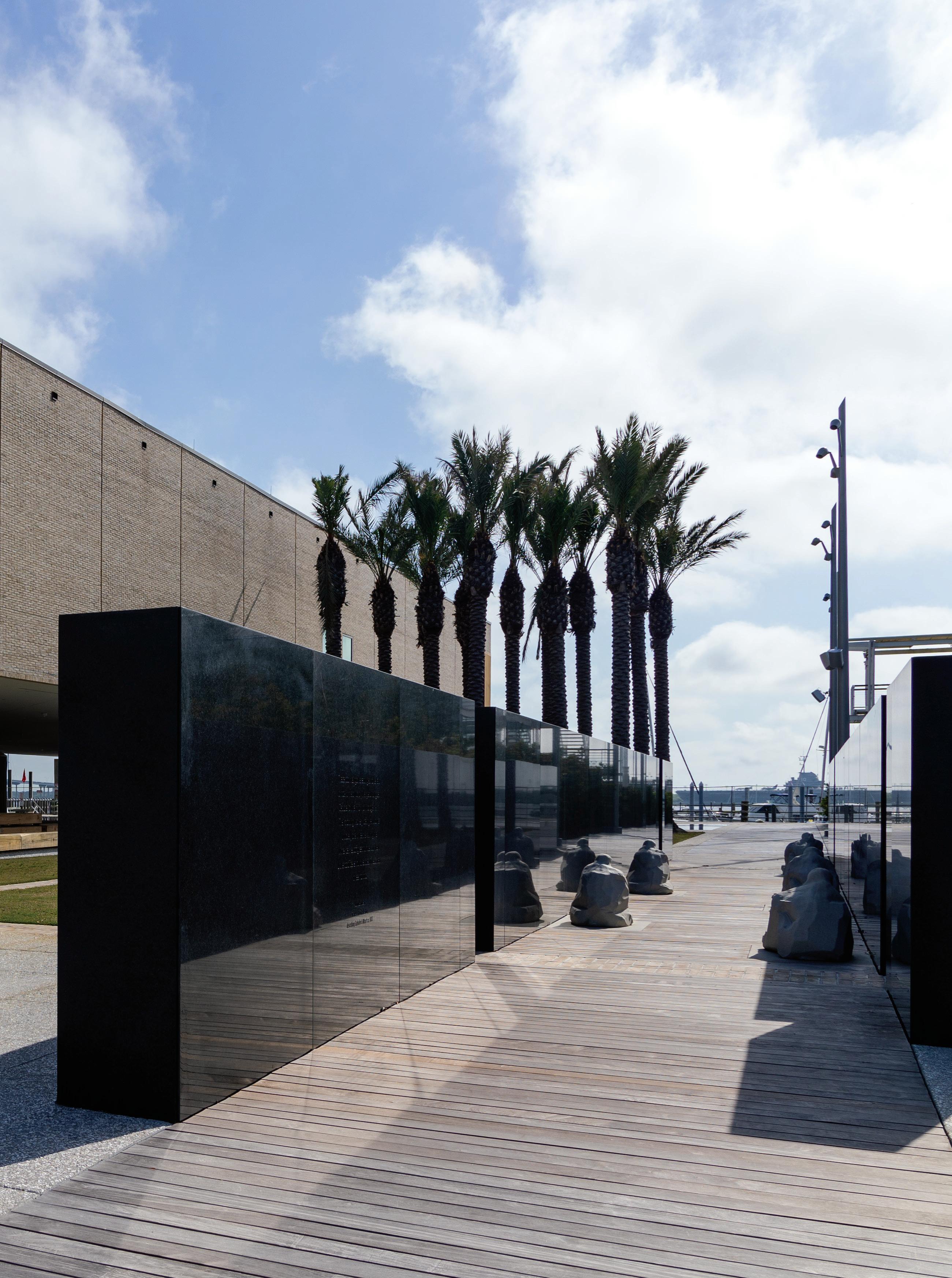 Other landscape design elements include a series of rhythmic dunes suggesting waves or burial mounds on the street side of the museum, a sweeping field of native sweetgrass and an ethno-botanic garden linking West Africa with the Lowcountry, as well as regal palm trees native to West Africa. An obelisk-like stelae garden suggests monuments, purposely undesignated “so visiting school groups can choose which ancestors or leader they might want to dedicate one to,” explains Dr. Tonya Matthews, the museum’s chief executive. On the museum’s east side, a massive black granite wall inscribed with a verse from Maya Angelou’s “Still I Rise” marks where a slave warehouse once stood. Archived records recount 700 captive Africans freezing to death while held there.