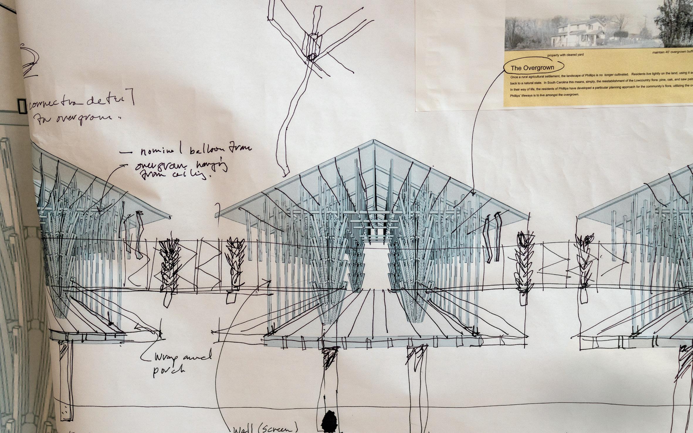 Upstairs, around a U-shaped conference table, Hood shuffles through his chunky sketchbook and large printouts of prototypes for his most recent, exciting and somewhat urgent endeavor—the 2023 Venice Architecture Biennale, a tremendous honor and opportunity that his team has just recently been given and now has only three months to prepare for.